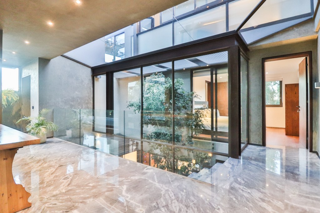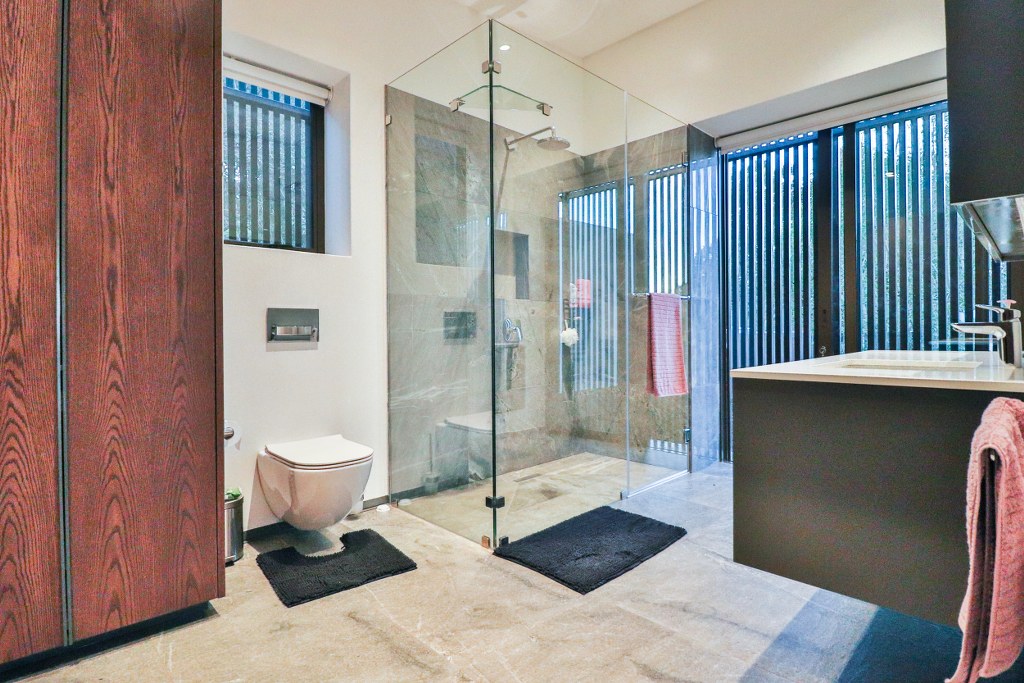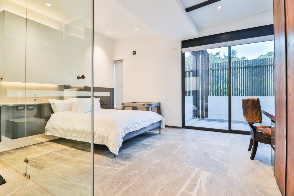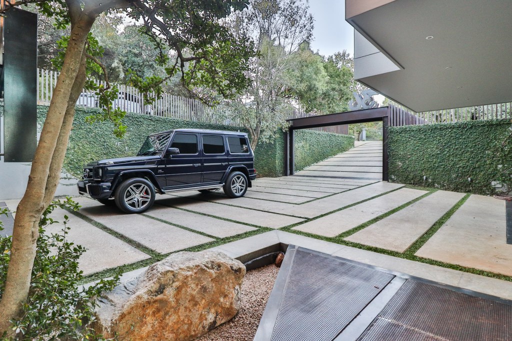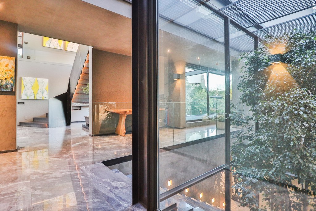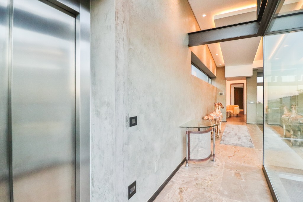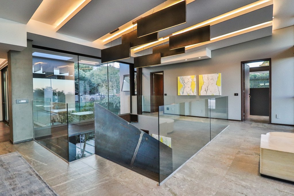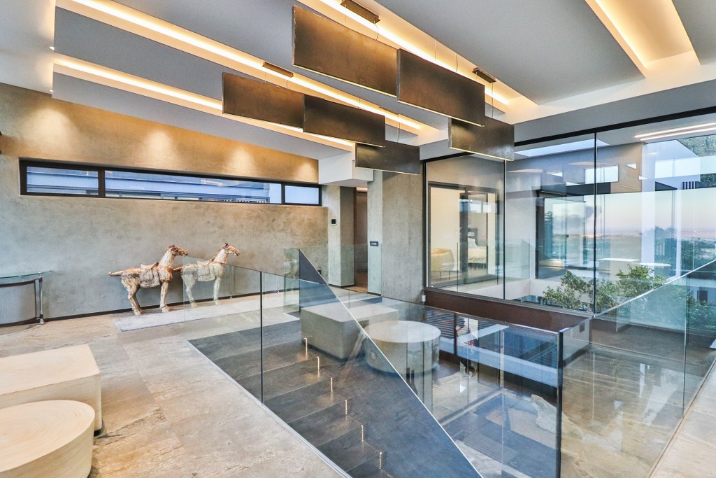 On entering, you are welcomed by a double volume grand entrance with a combination of industrial steel and polished granite floors. The glass entrance door leads into a curved steel staircase. This level also boasts a guest bedroom en-suite (wheelchair friendly), and two double interleading garages.