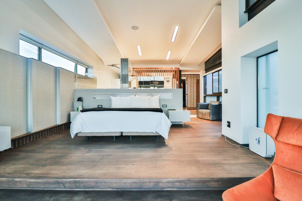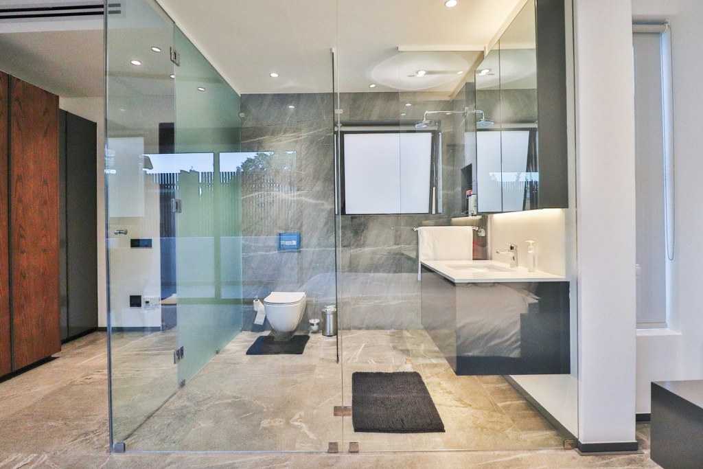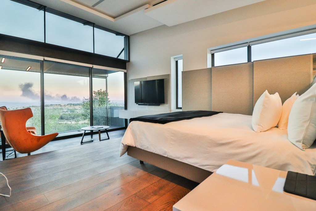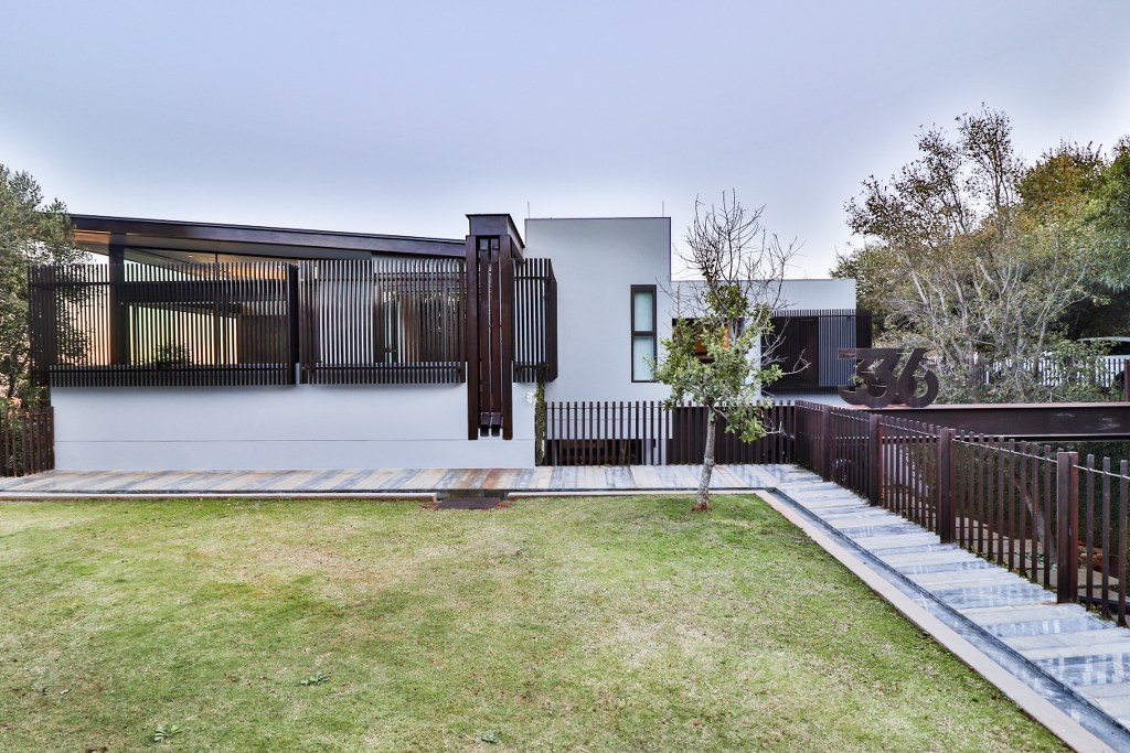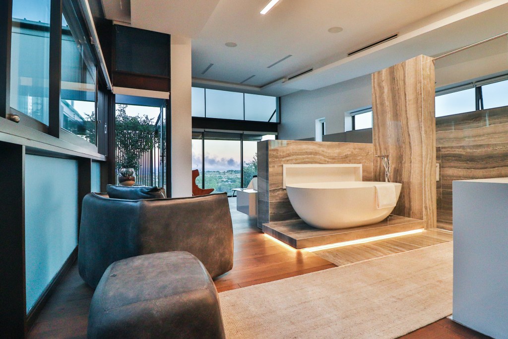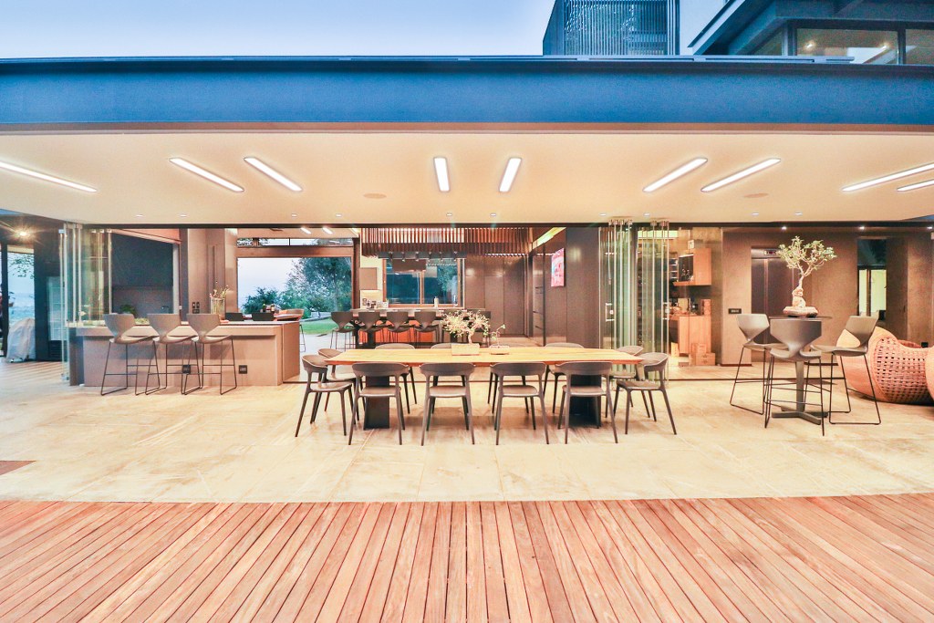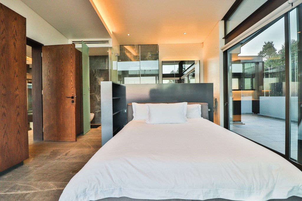 On entering, you are welcomed by a double volume grand entrance with a combination of industrial steel and polished granite floors. The glass entrance door leads into a curved steel staircase. This level also boasts a guest bedroom en-suite (wheelchair friendly), and two double interleading garages.