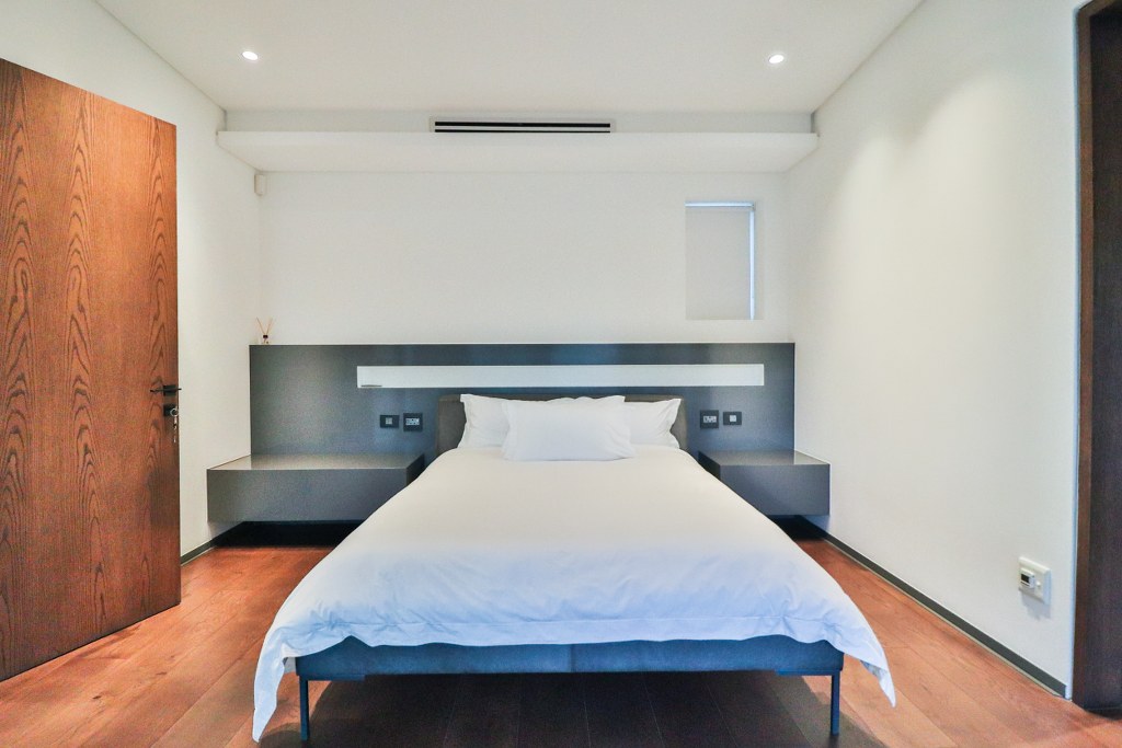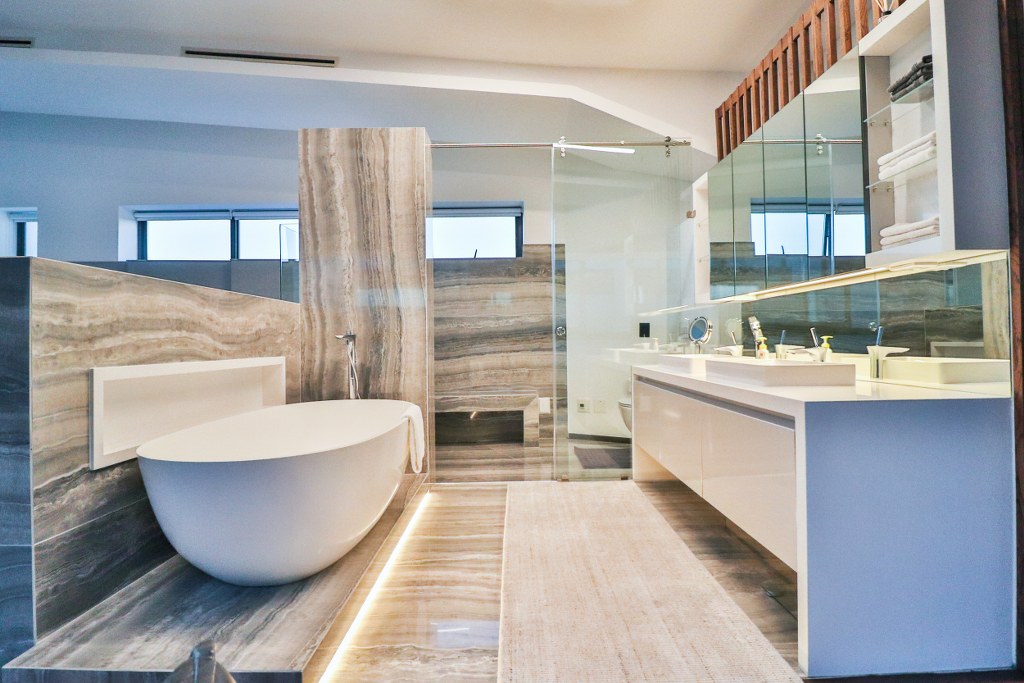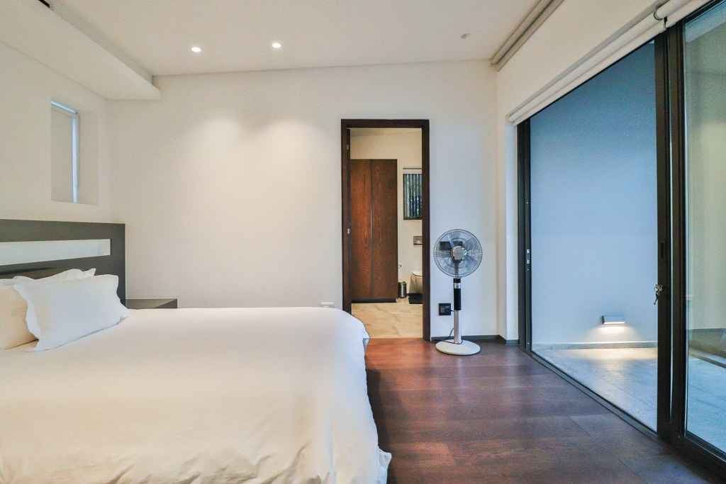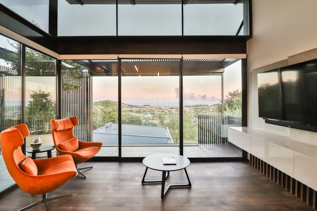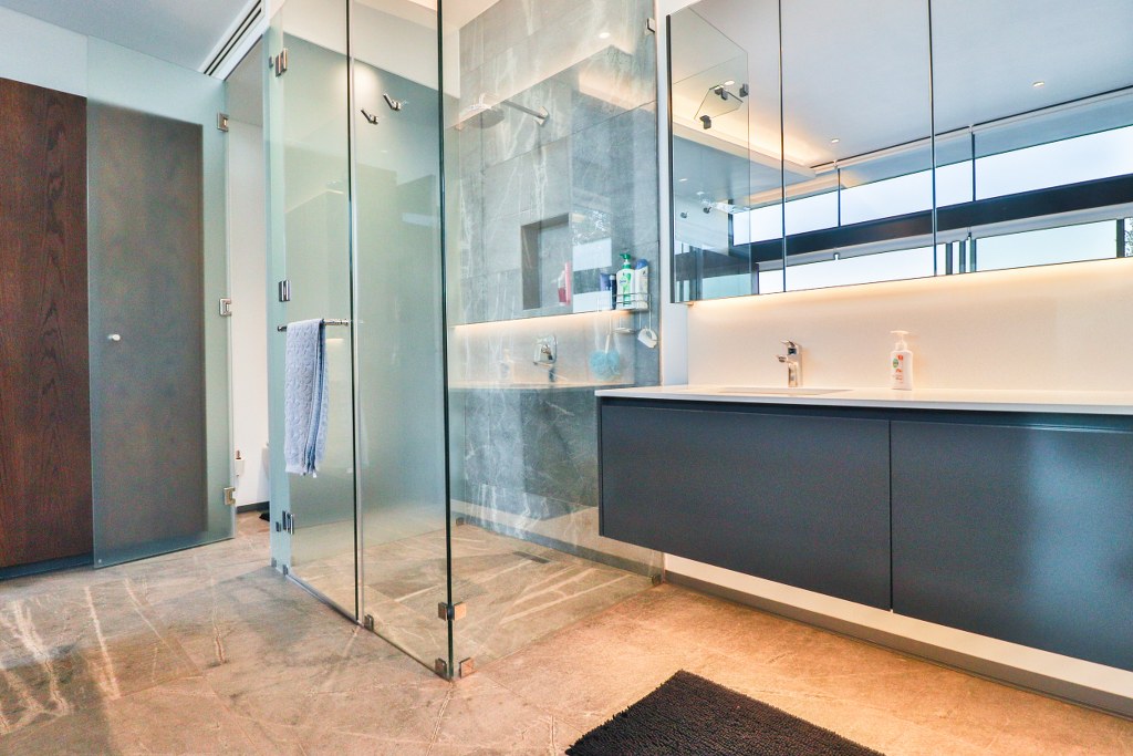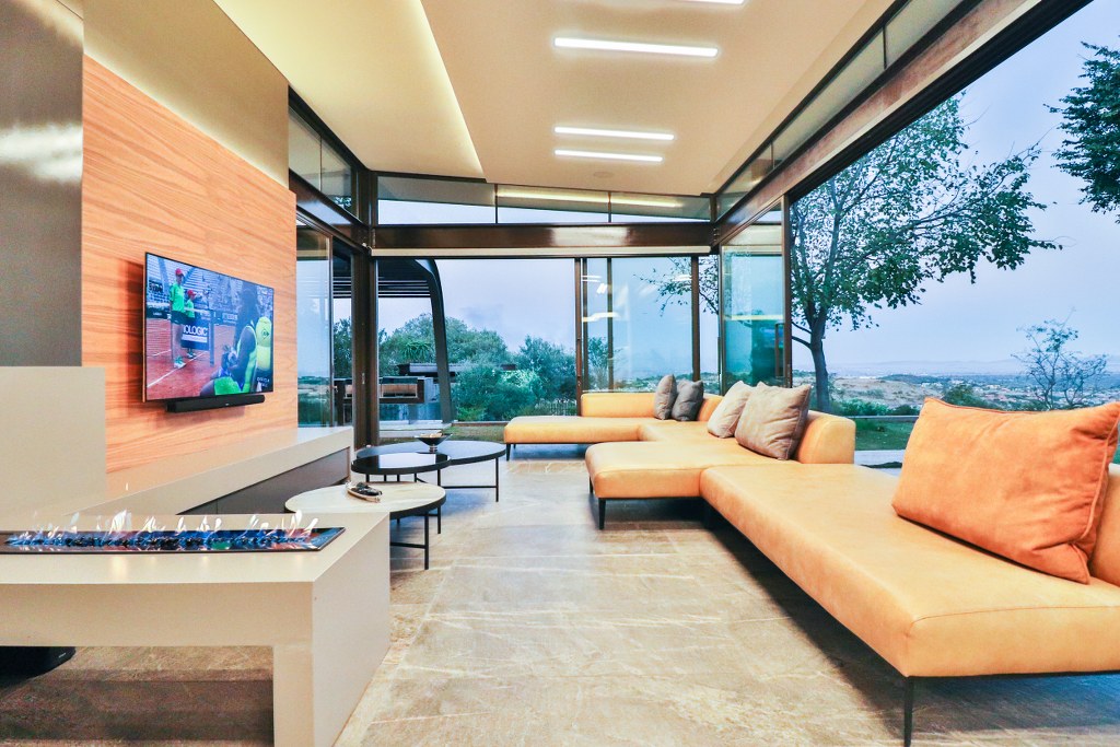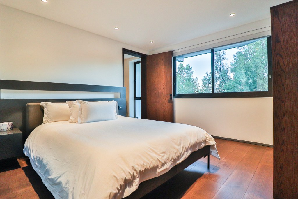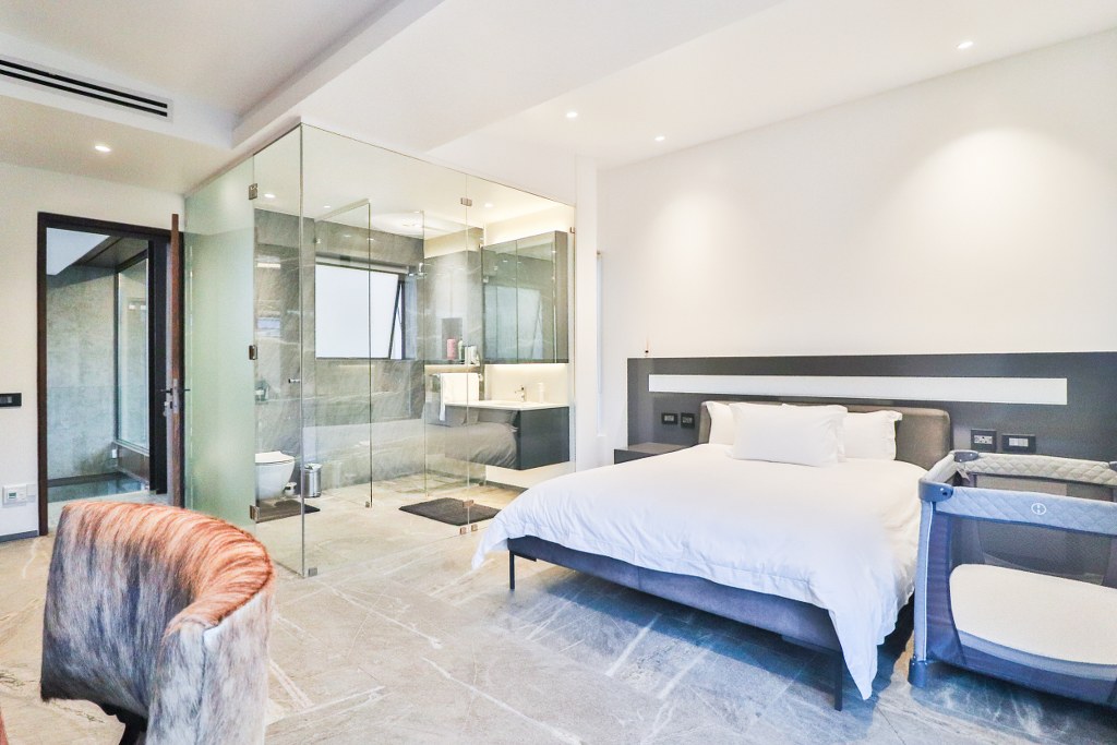 On entering, you are welcomed by a double volume grand entrance with a combination of industrial steel and polished granite floors. The glass entrance door leads into a curved steel staircase. This level also boasts a guest bedroom en-suite (wheelchair friendly), and two double interleading garages.