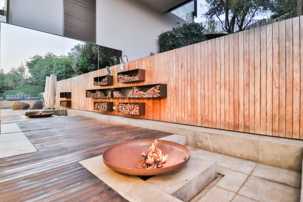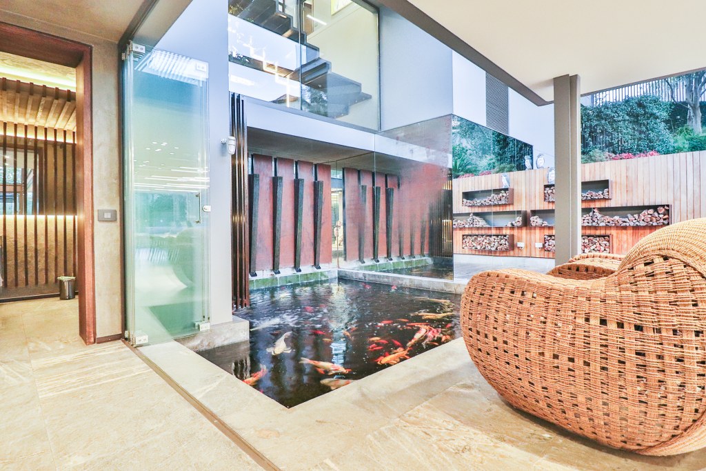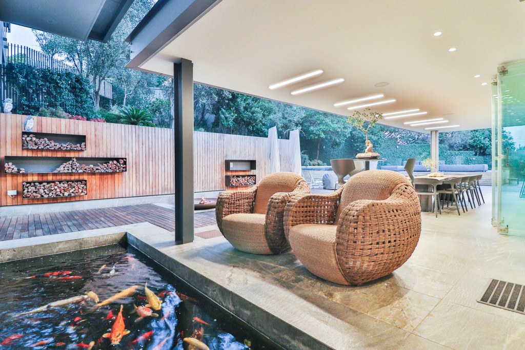 The stairway leading downstairs to the living and entertaining areas offers unpolished (raw) granite flooring and frameless stack doors opening out onto the outside entertainment area which includes a glass wine cellar, private tv room, koi pond, undercover patio, swimming pool with an automatic pool cover, lounge with gas fireplace and endless views.