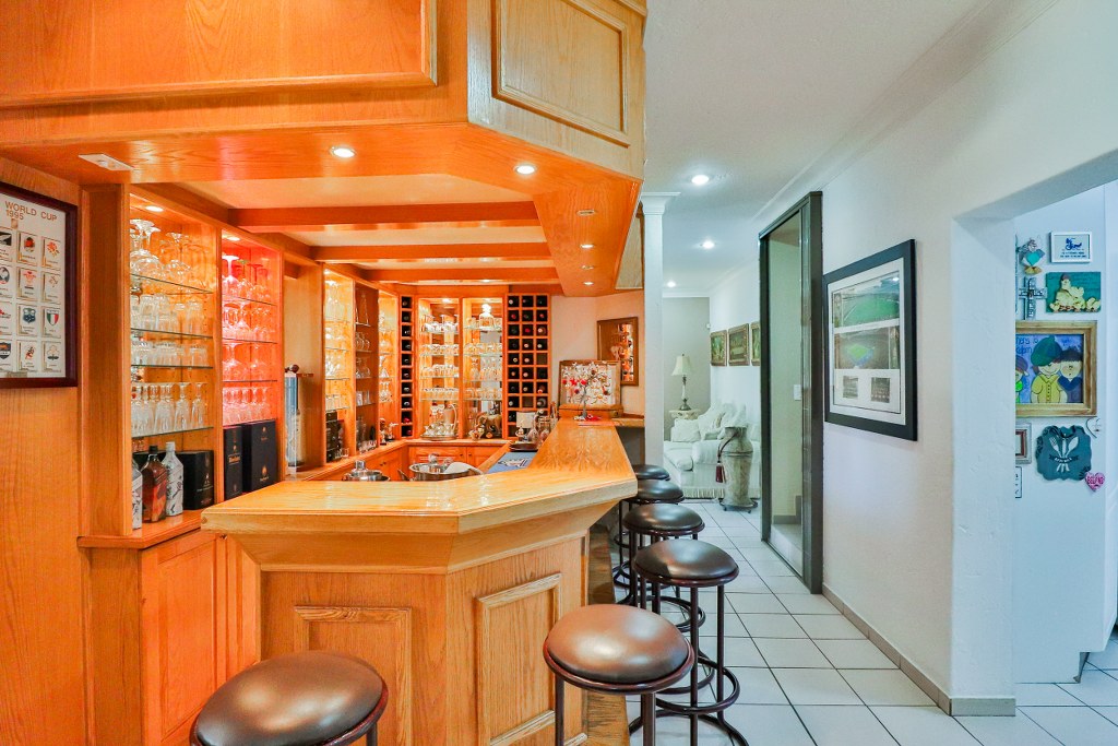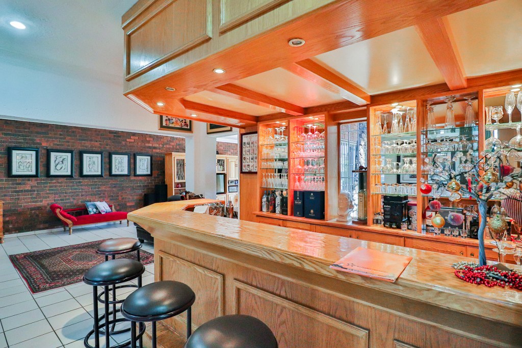 Walking through the home we come to what can only be described as the heart of the home, a united area that allows for special times with family and friends. The first feature in this space is the neat bar area, which its solid wood finish and under counter space for a bar fridge, this over looks the large dining area of this family home. The massive TV lounge can be found just off the dining space, with sliding doors that open to the front garden with views overlooking the sparkling swimming pool.