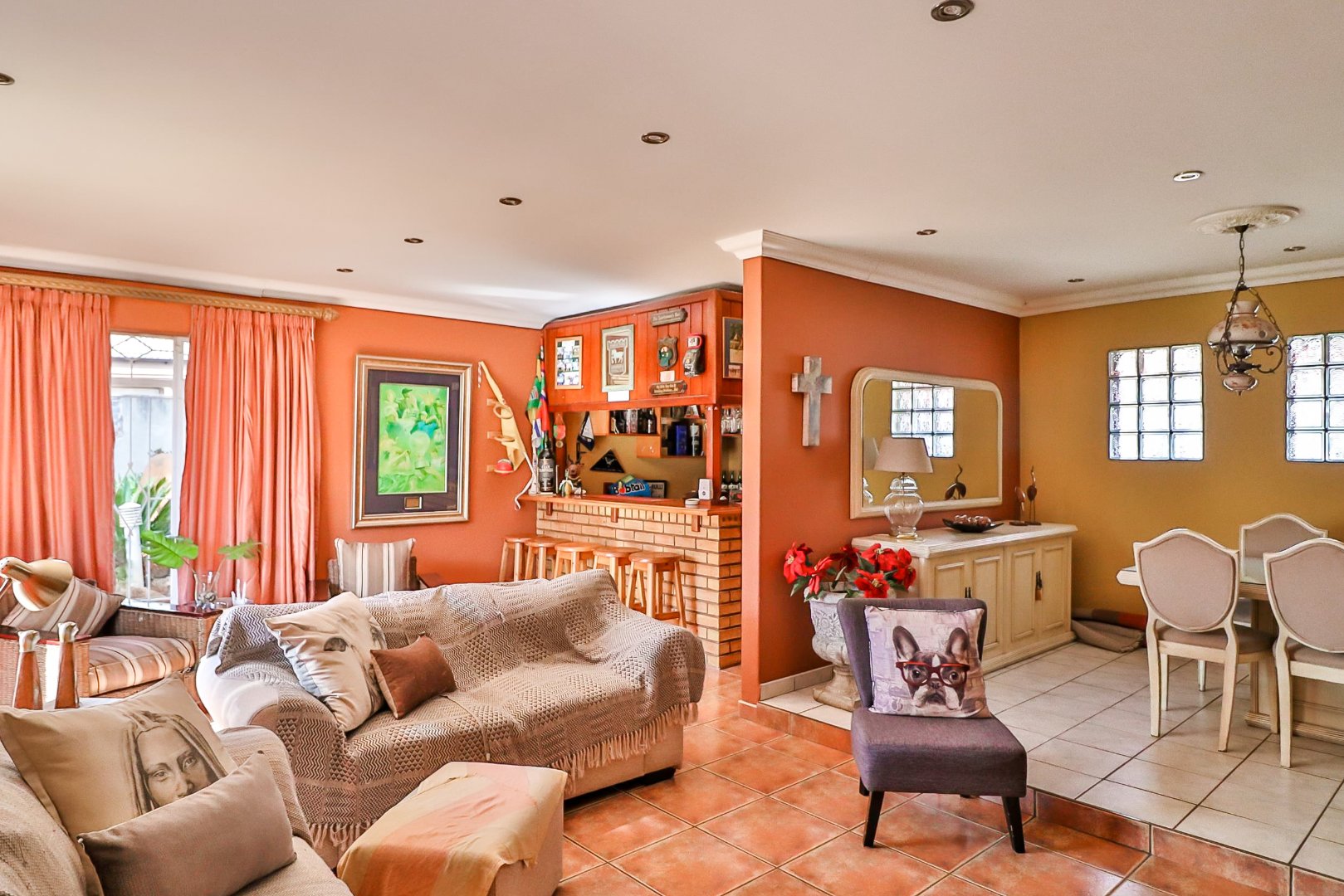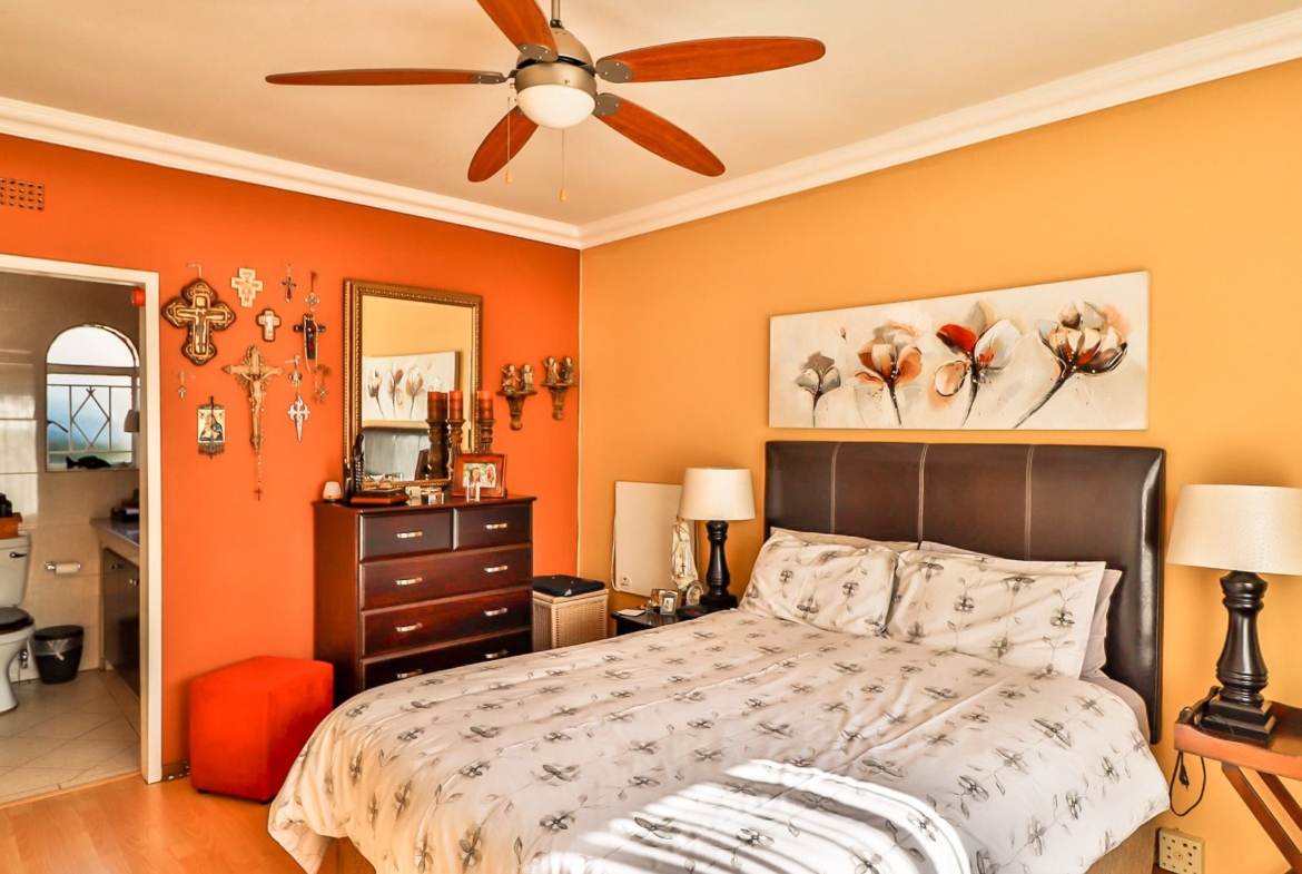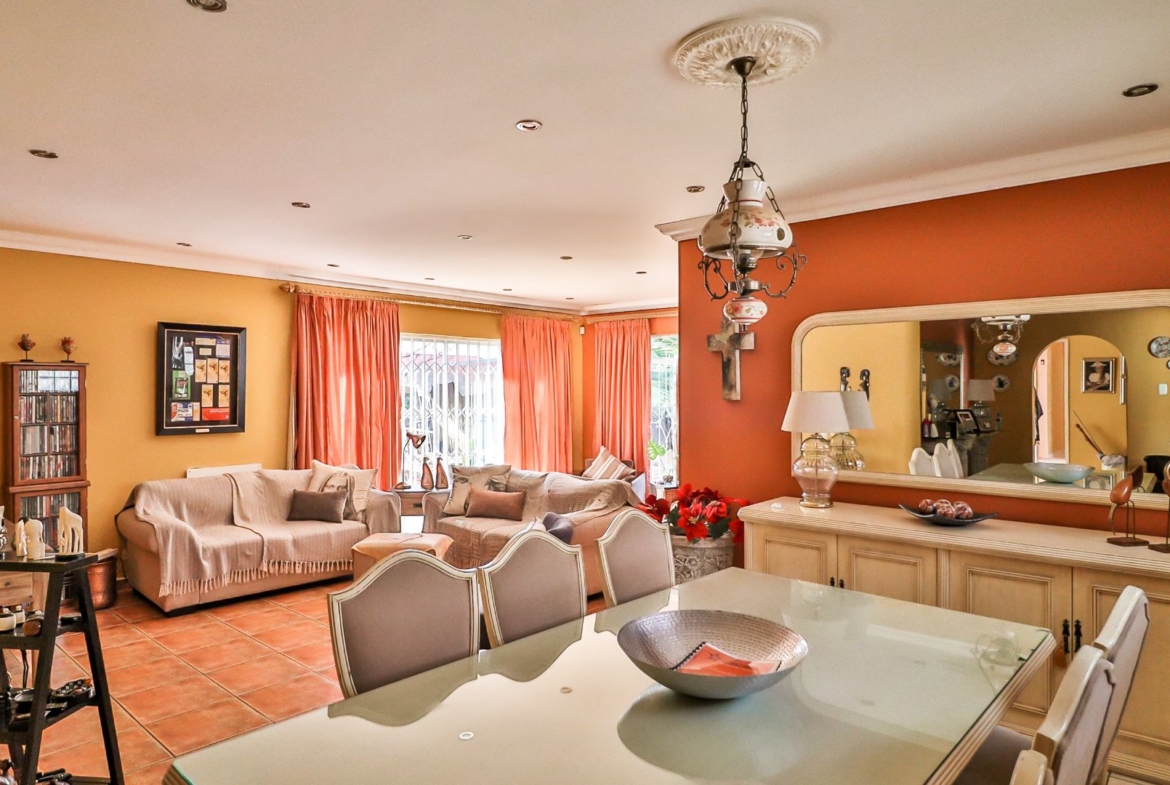 This home offers 4 bedrooms, 2 bathrooms (main en-suite, Spacious open plan dining room, lounge and bar area which opens out into the well manicured garden. 2nd Formal lounge and a functional modern kitchen.