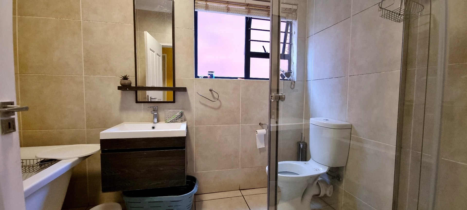 The spacious bedrooms include built-in cupboards, with the main bedroom boasting an en suite with a toilet, shower, and basin. The modern guest bathroom is generously sized, featuring both a bath and shower.