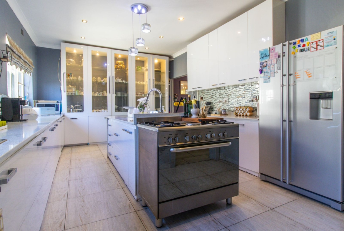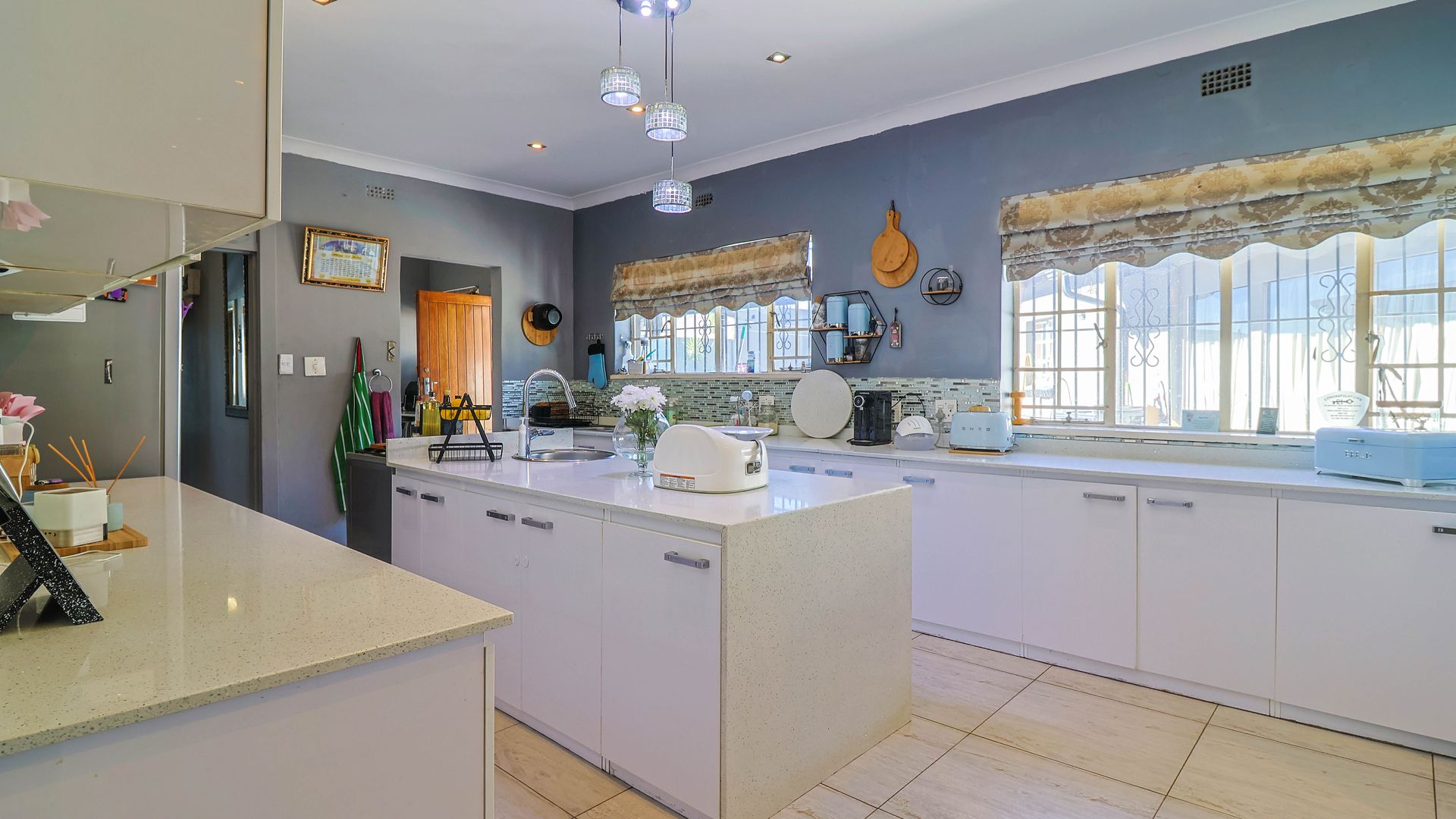 As you enter, you’re welcomed by an expansive living room seamlessly flowing into an open-plan dining area — perfect for entertaining. Adjoining this space is a beautifully fitted kitchen featuring Caesarstone countertops, a center island, ample cupboard space including glass display cabinets, a gas hob, and a separate scullery for added convenience.