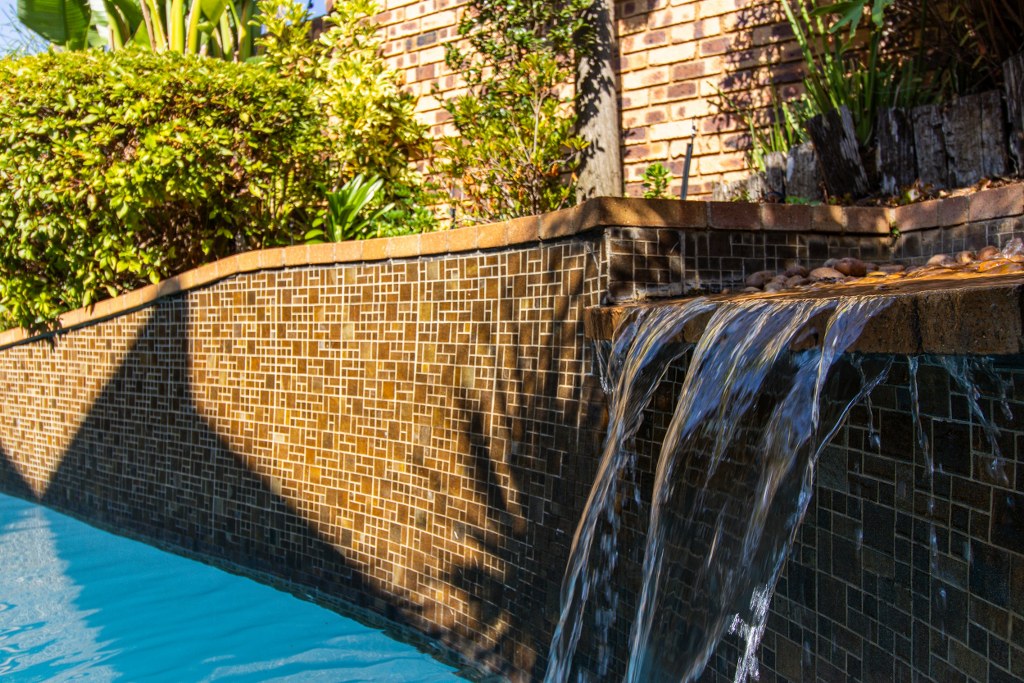 Outdoor Amenities: Serene private garden, swimming pool with fountain, and a small bar