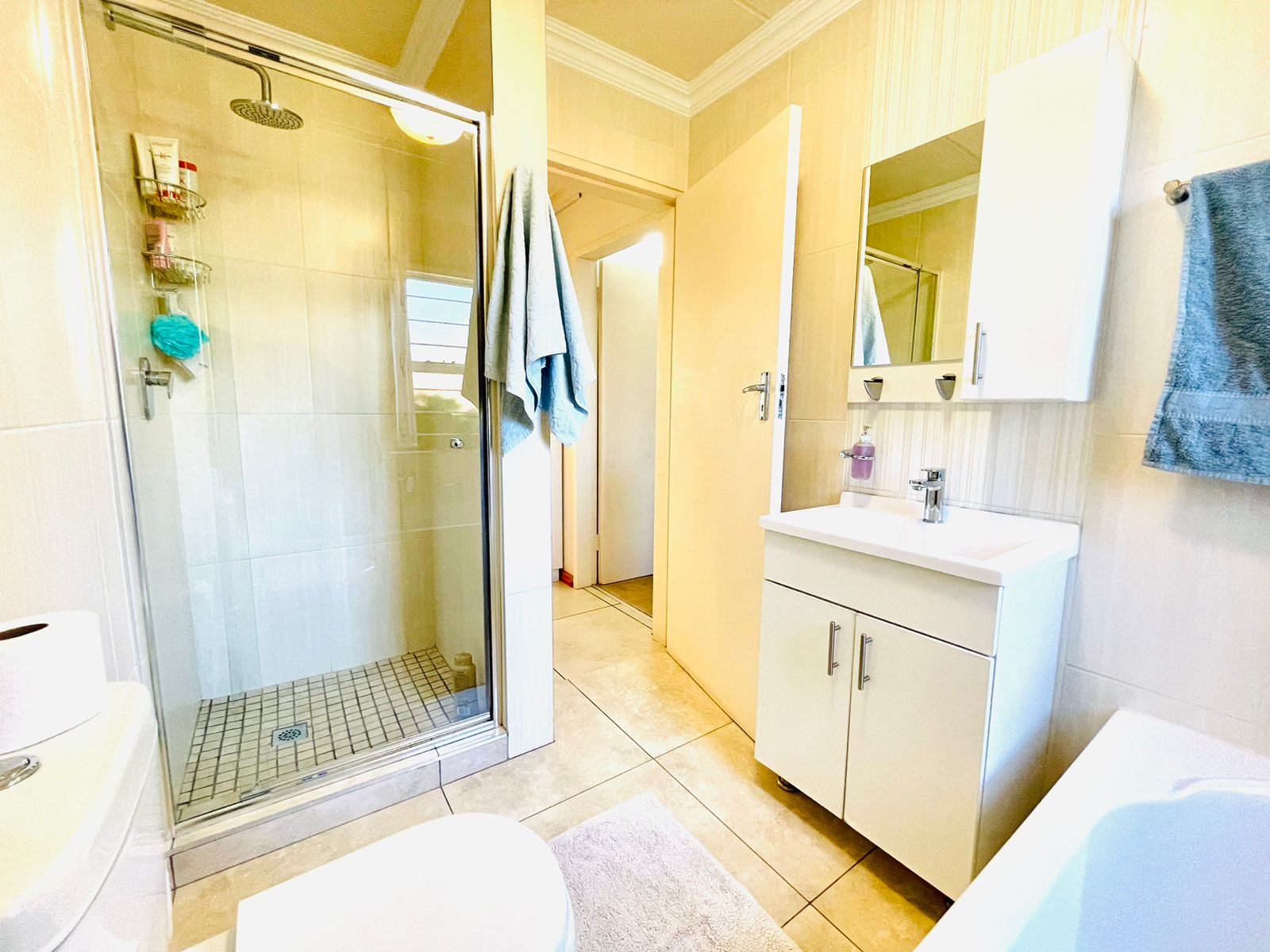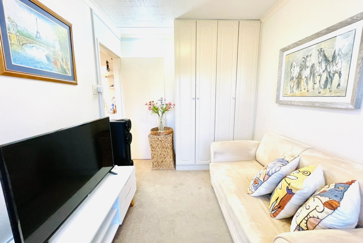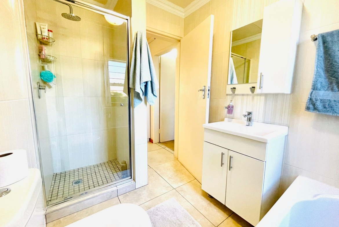 The property boasts 2 bedrooms with built-in cupboards and 1 full bathroom that includes a shower and bath.