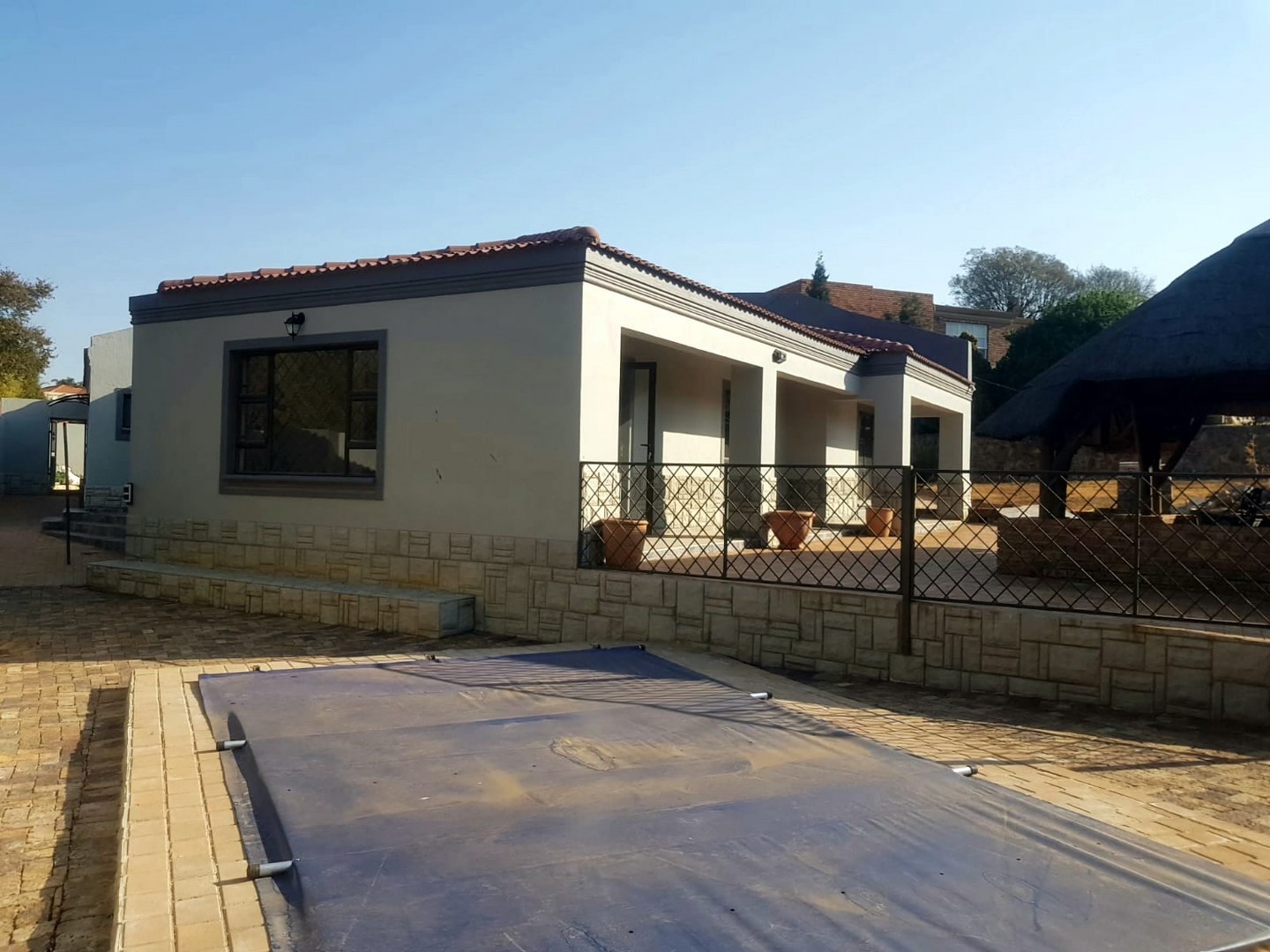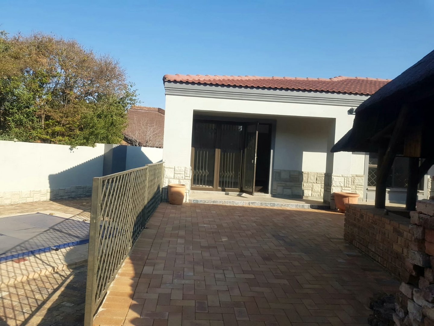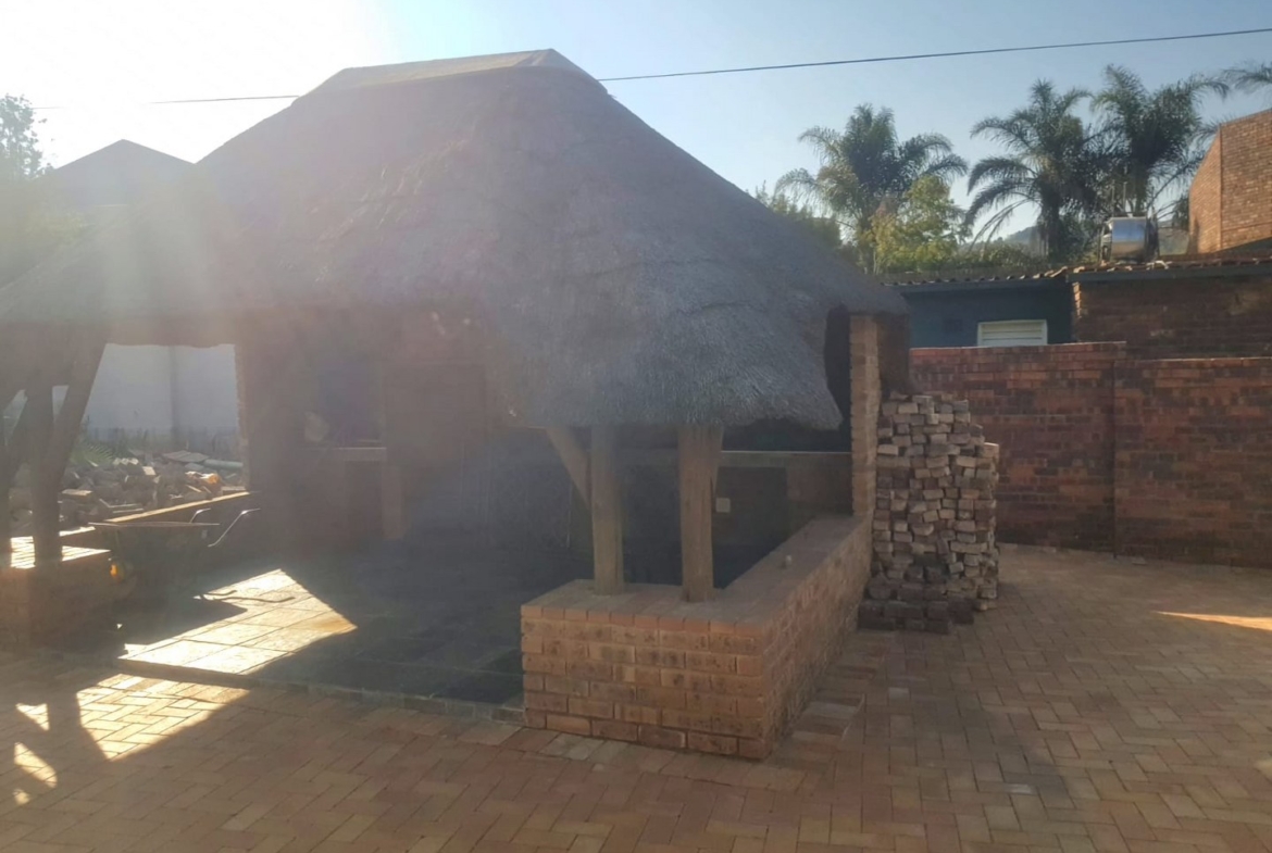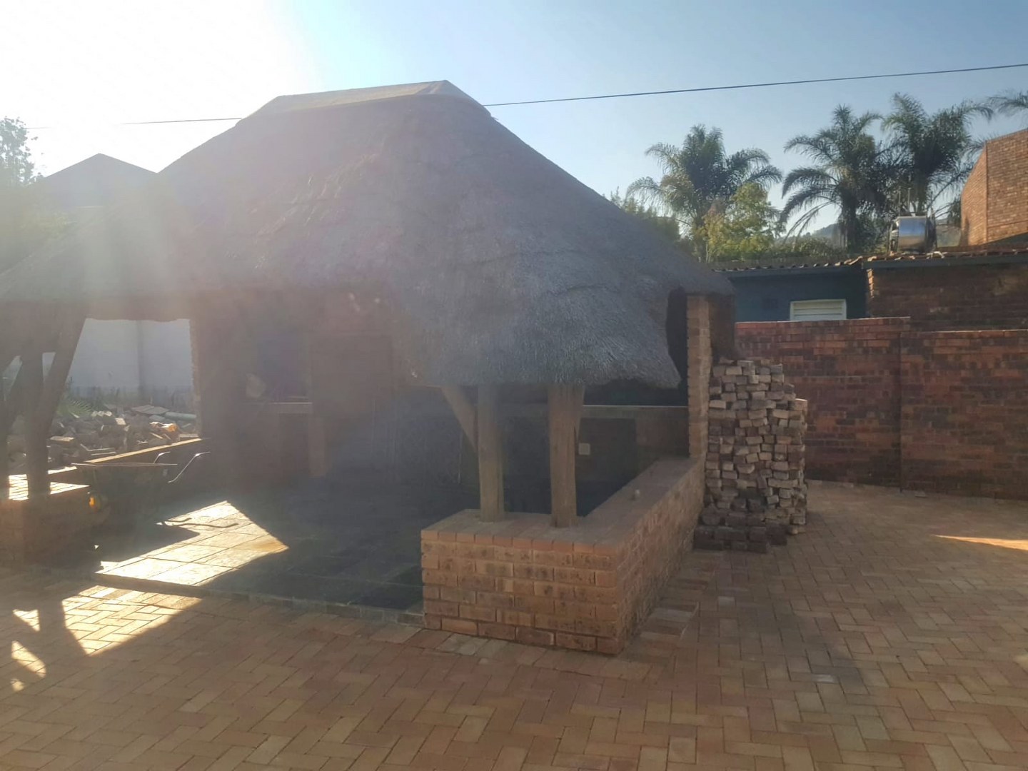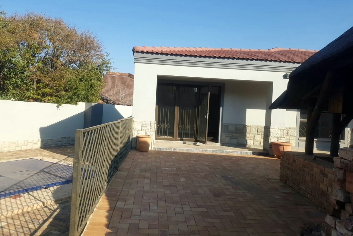 The home boasts solid wooden floors throughout, adding warmth and character. The entertainment area features a lapa and a swimming pool, ideal for outdoor relaxation.
