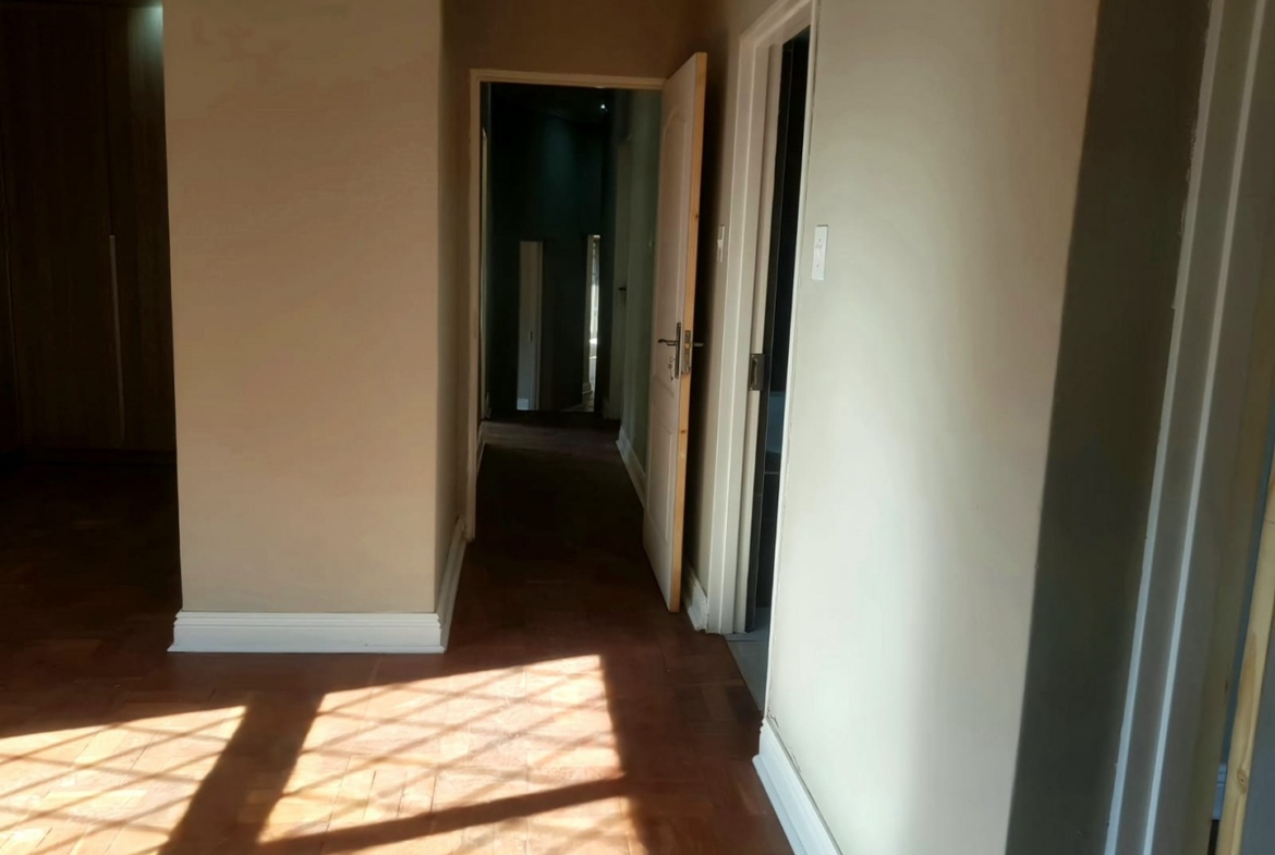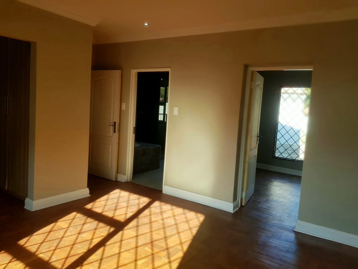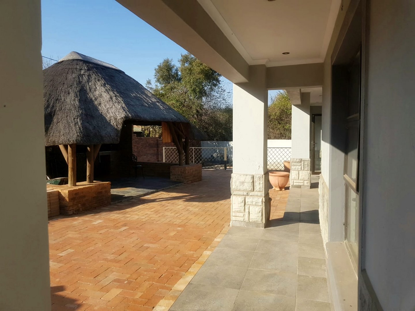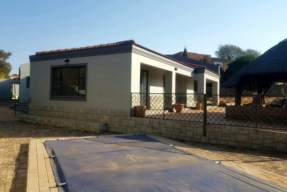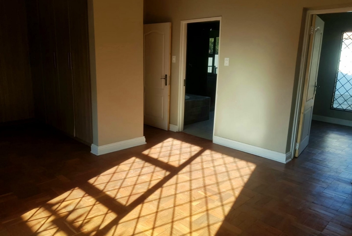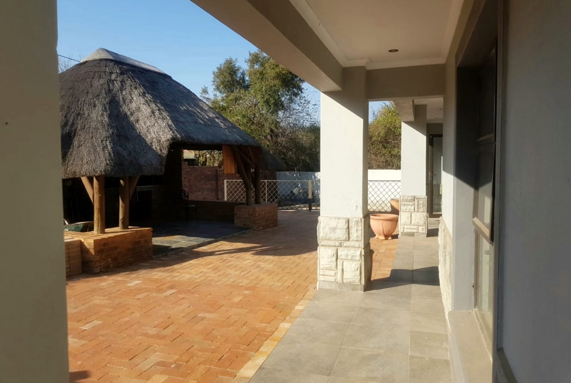 The home boasts solid wooden floors throughout, adding warmth and character. The entertainment area features a lapa and a swimming pool, ideal for outdoor relaxation.