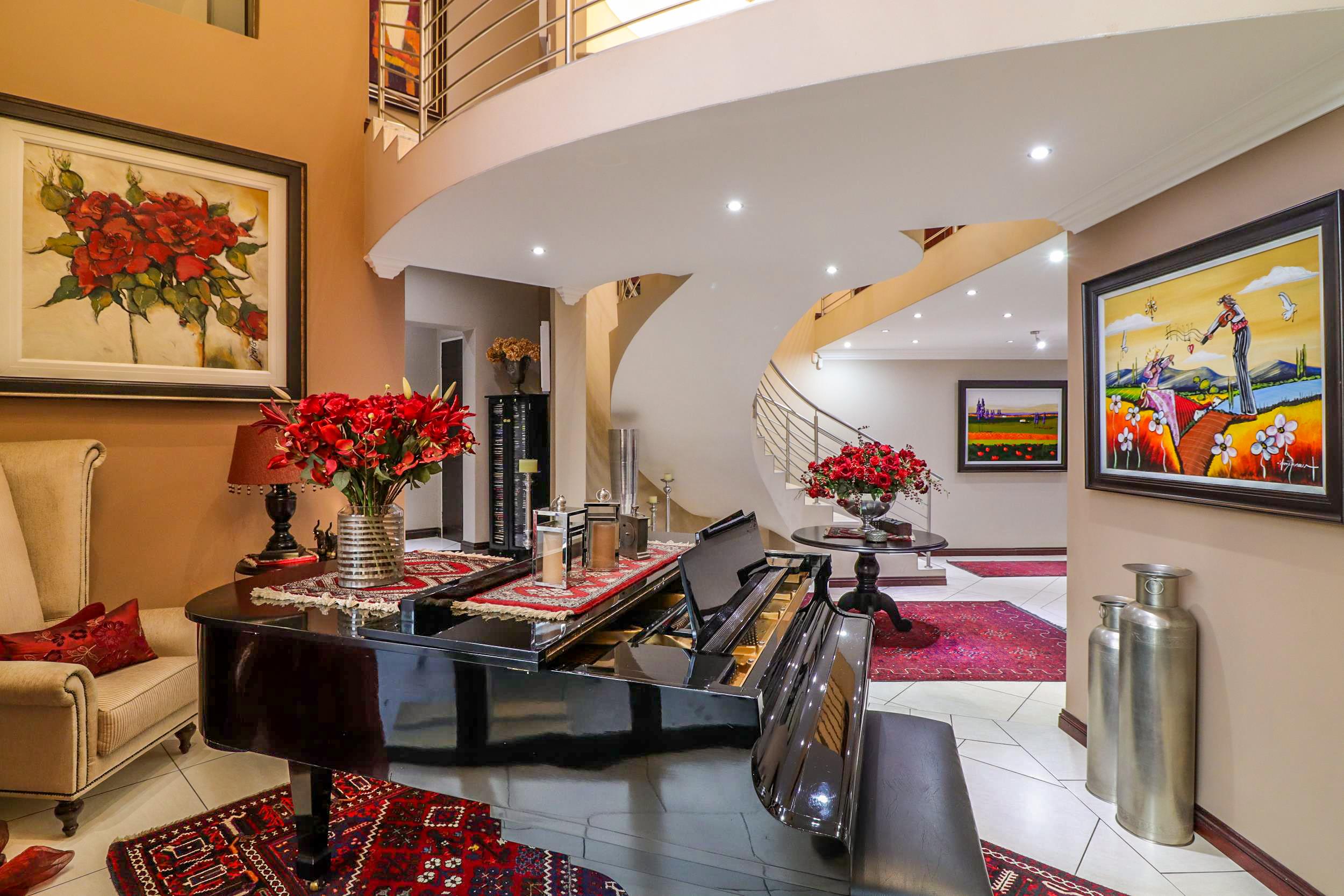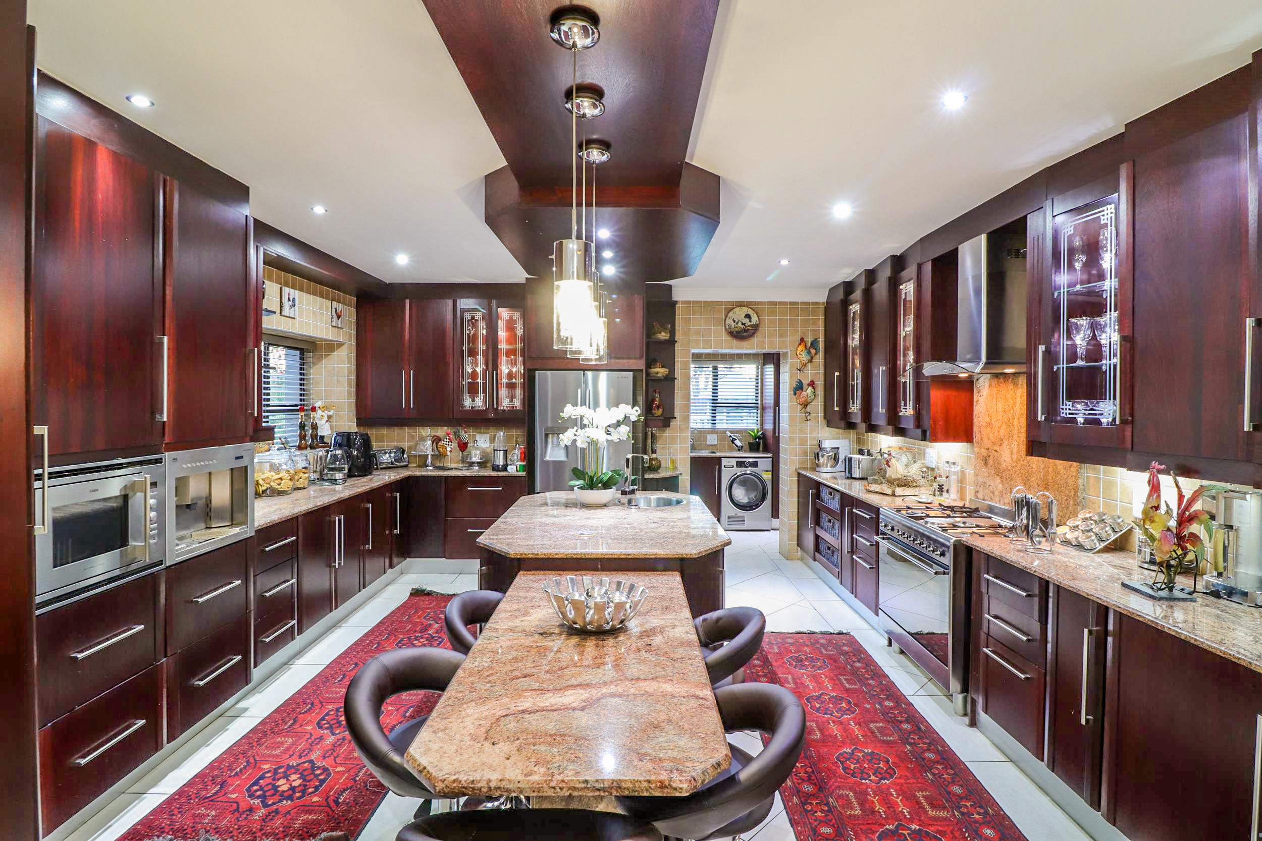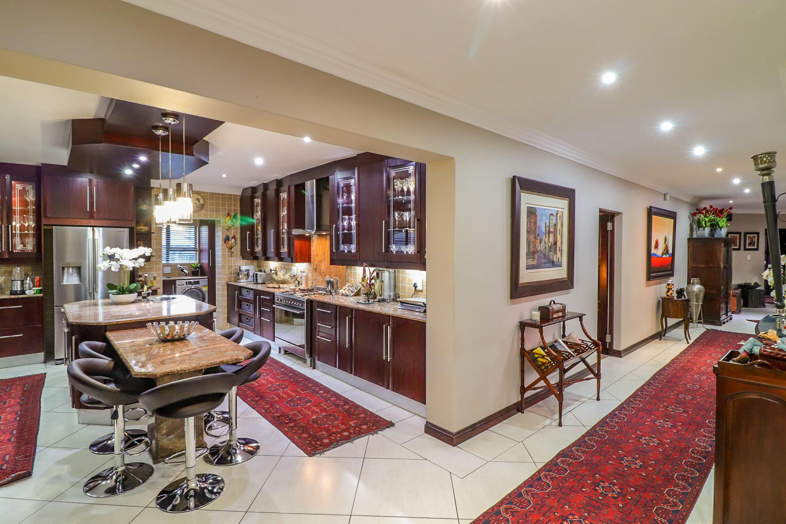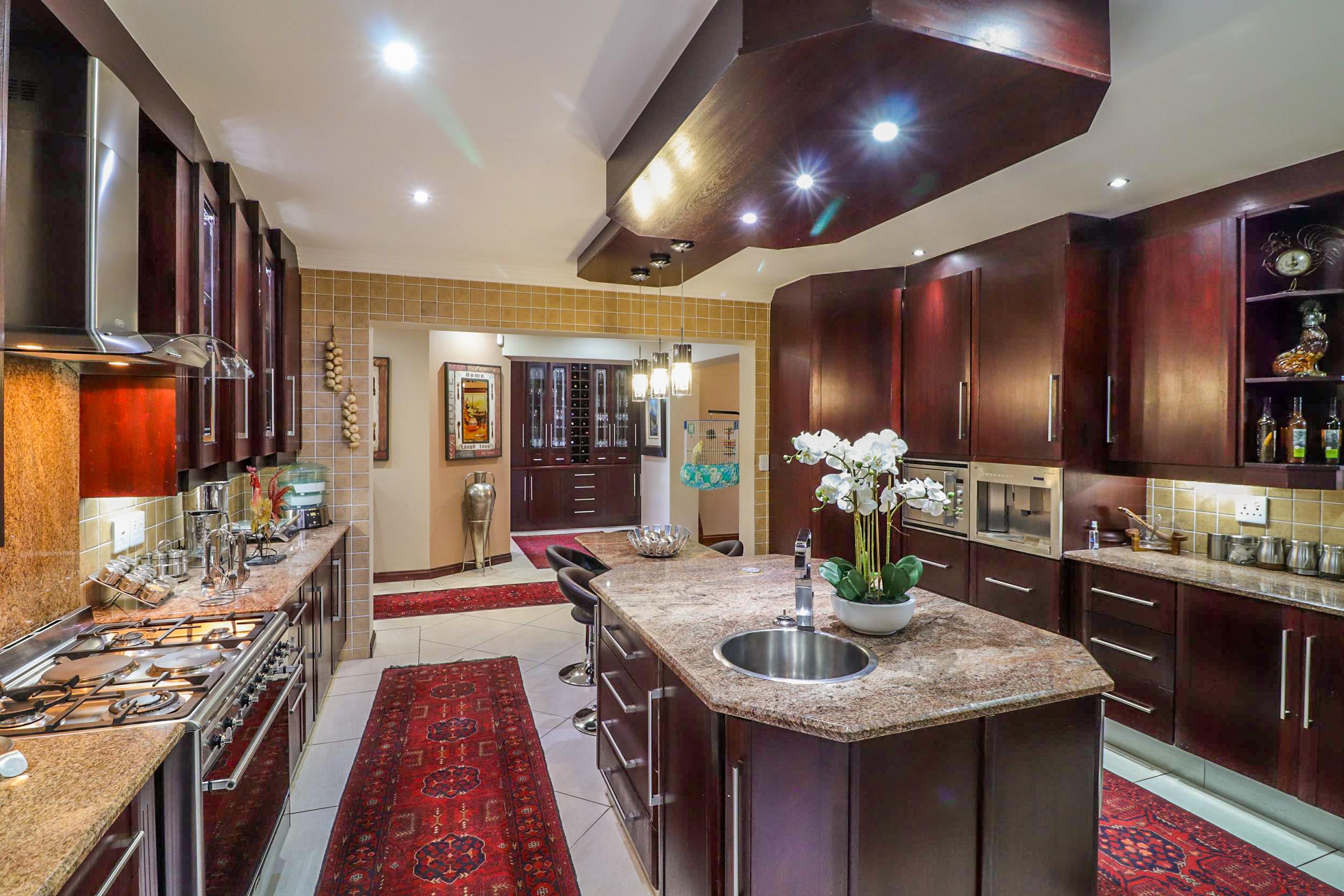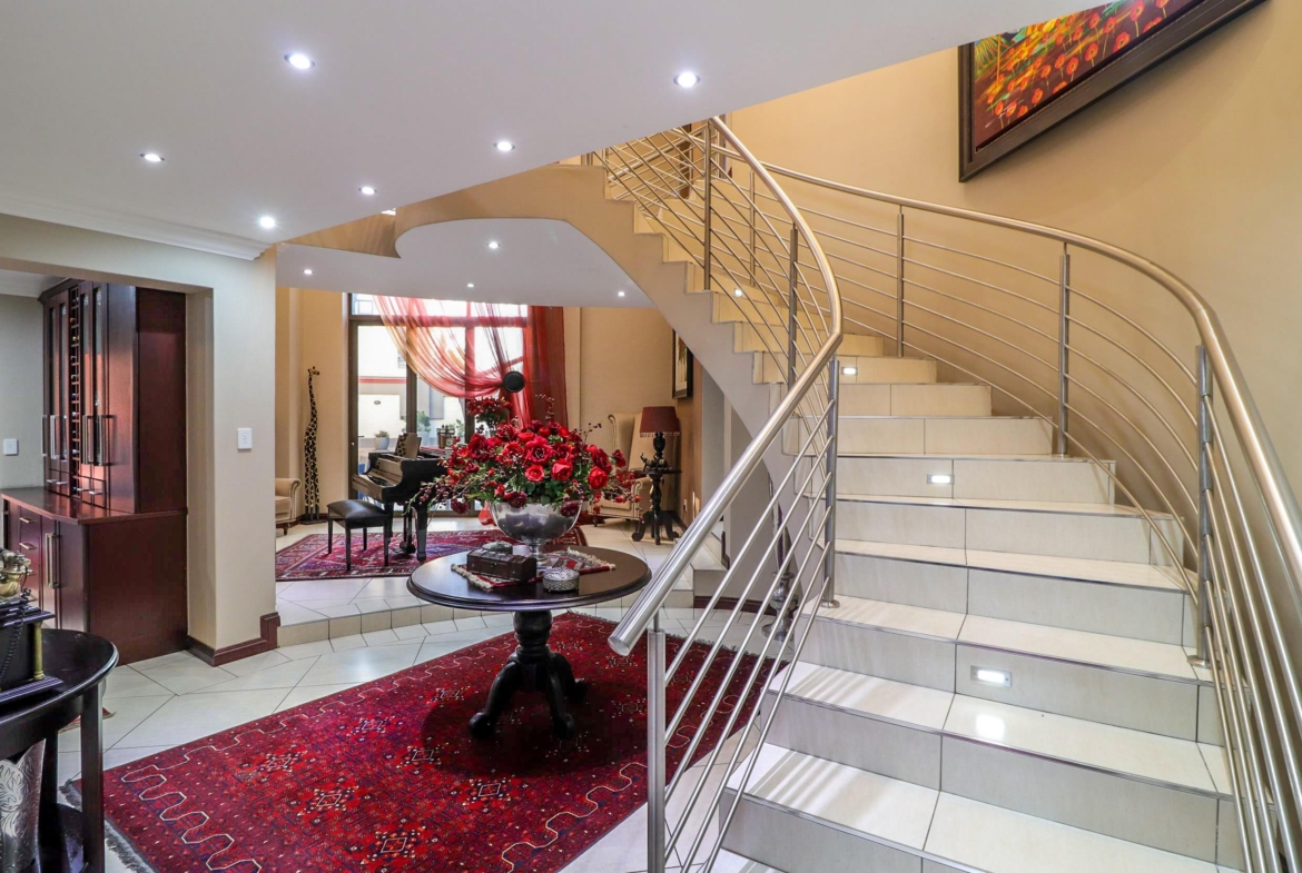 This luxurious home was master built and designed to exacting standards of perfection with attention to detail and faultless workmanship. The inviting entrance sets the tone for the home that offers simplicity and pleasure of luxury combined with comfort. The double front door opens to high volumes. A curved staircase with large windows overlooking the pool and entertainment area. Formal lounge with large cascading windows overlooking the pool area. A 14 seater luxury dining room, the well designed kitchen has granite surfaces, a central island a prep bowl, double ovens, separate scullery and outside laundry. Family lounge offers fitted TV wall unit, gas fireplace, stack doors to the entrainment area, guest bathroom, entertainment room with built in wooden bar built-in braai, guest toilet, snooker room with stack doors to the outside entertainment area. PJ lounge with fitted kitchenette, study, 6 glamorous bedrooms, 6 luxury bathrooms.
