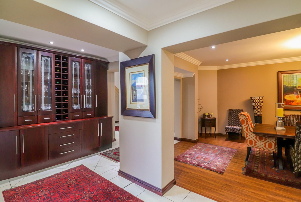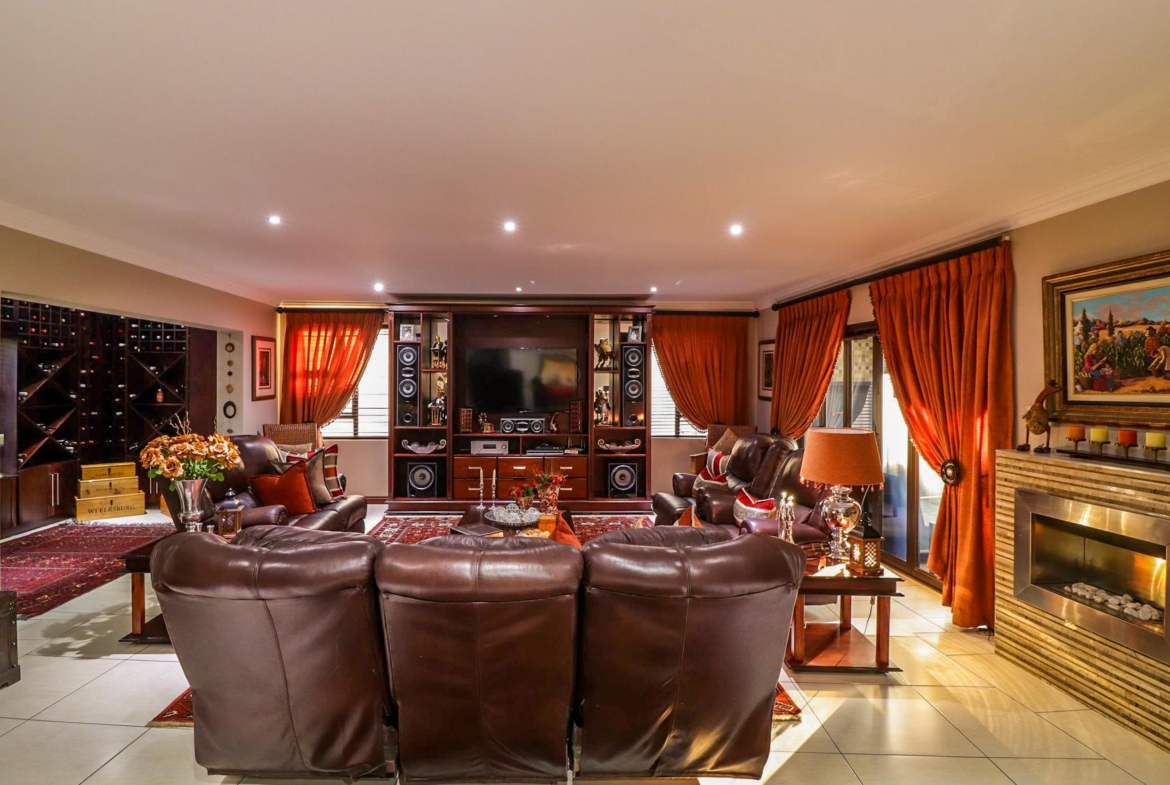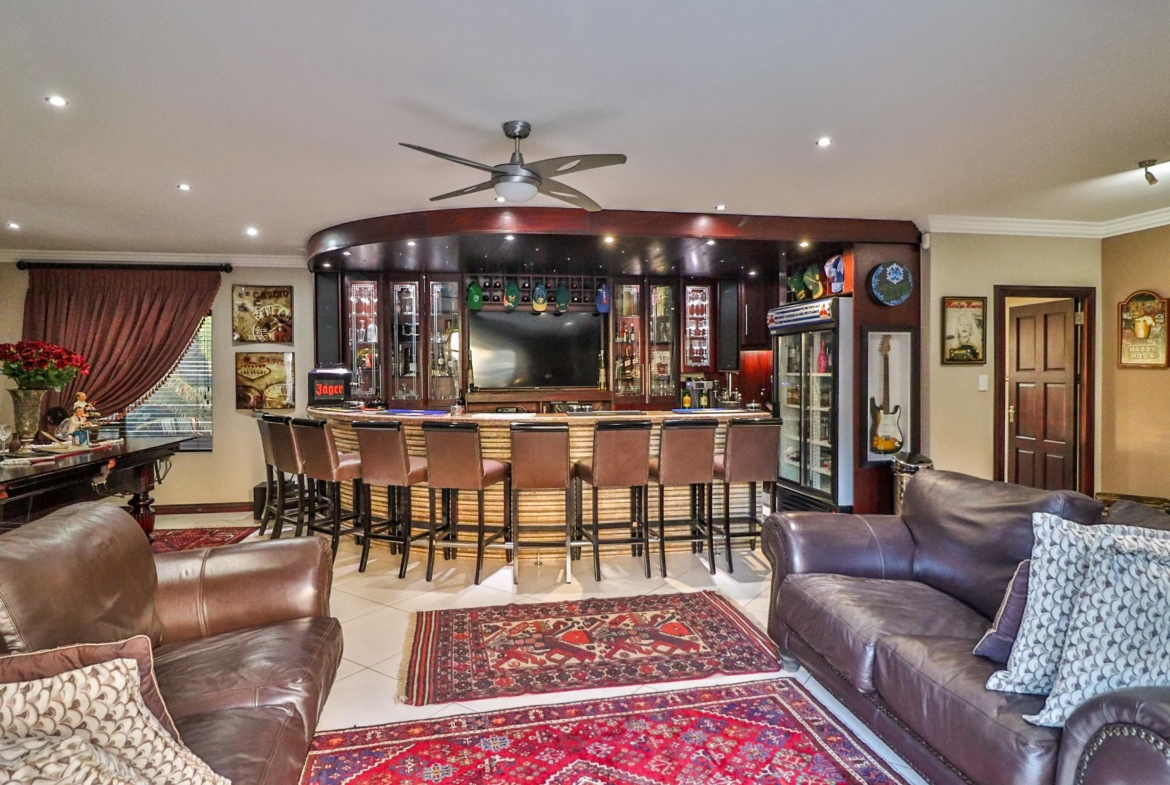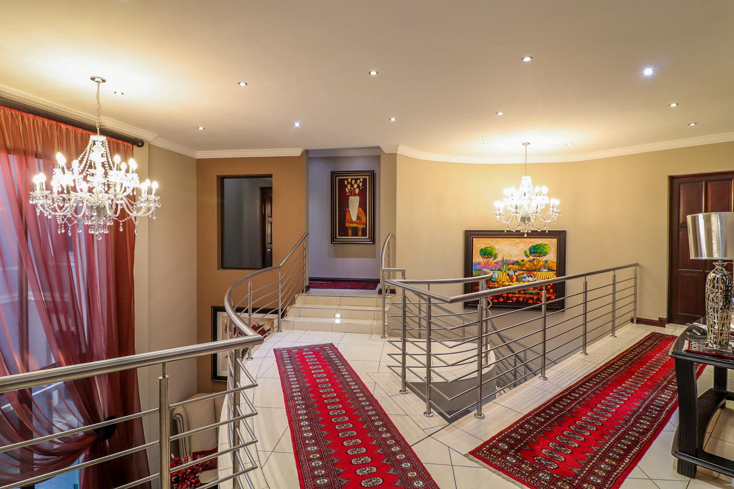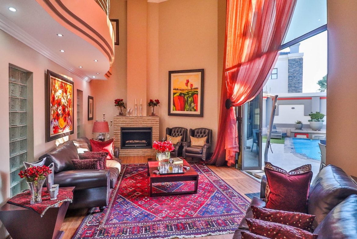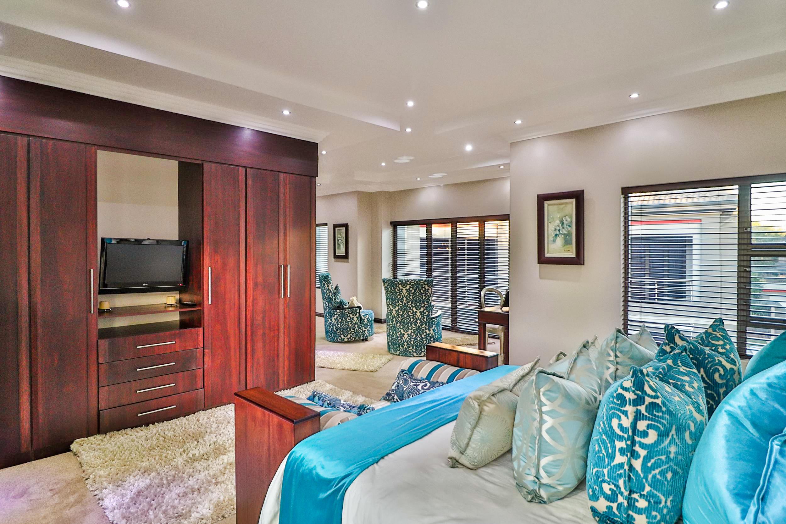 This luxurious home was master built and designed to exacting standards of perfection with attention to detail and faultless workmanship. The inviting entrance sets the tone for the home that offers simplicity and pleasure of luxury combined with comfort. The double front door opens to high volumes. A curved staircase with large windows overlooking the pool and entertainment area. Formal lounge with large cascading windows overlooking the pool area. A 14 seater luxury dining room, the well designed kitchen has granite surfaces, a central island a prep bowl, double ovens, separate scullery and outside laundry. Family lounge offers fitted TV wall unit, gas fireplace, stack doors to the entrainment area, guest bathroom, entertainment room with built in wooden bar built-in braai, guest toilet, snooker room with stack doors to the outside entertainment area. PJ lounge with fitted kitchenette, study, 6 glamorous bedrooms, 6 luxury bathrooms.