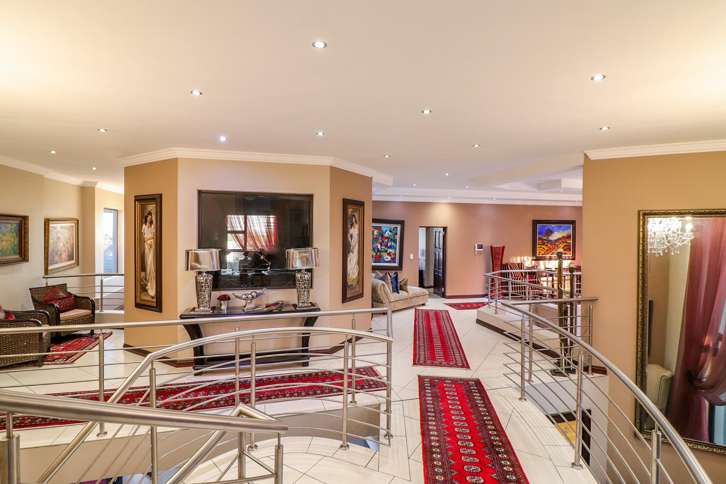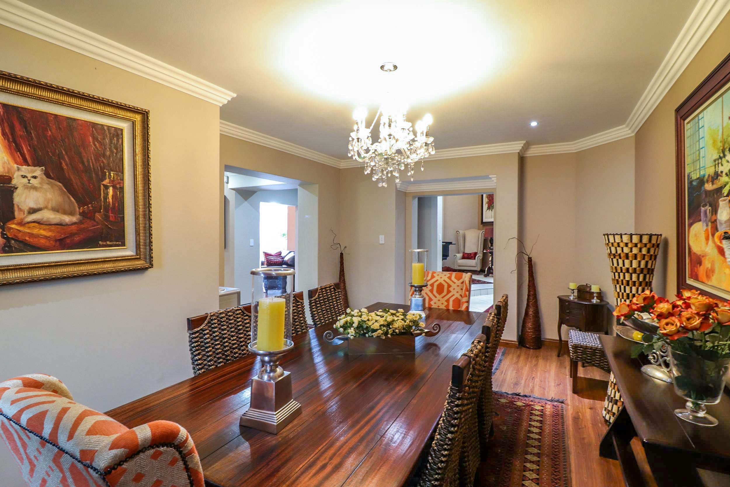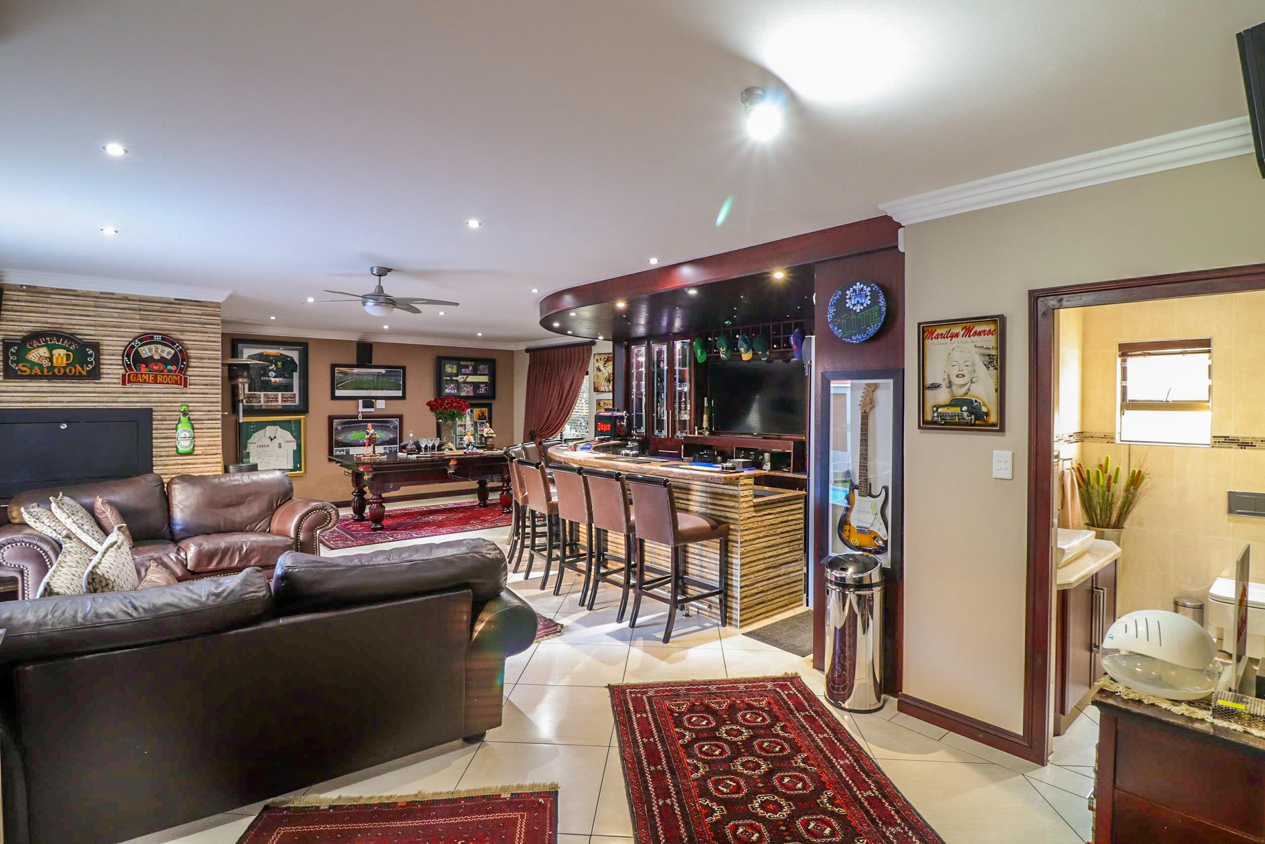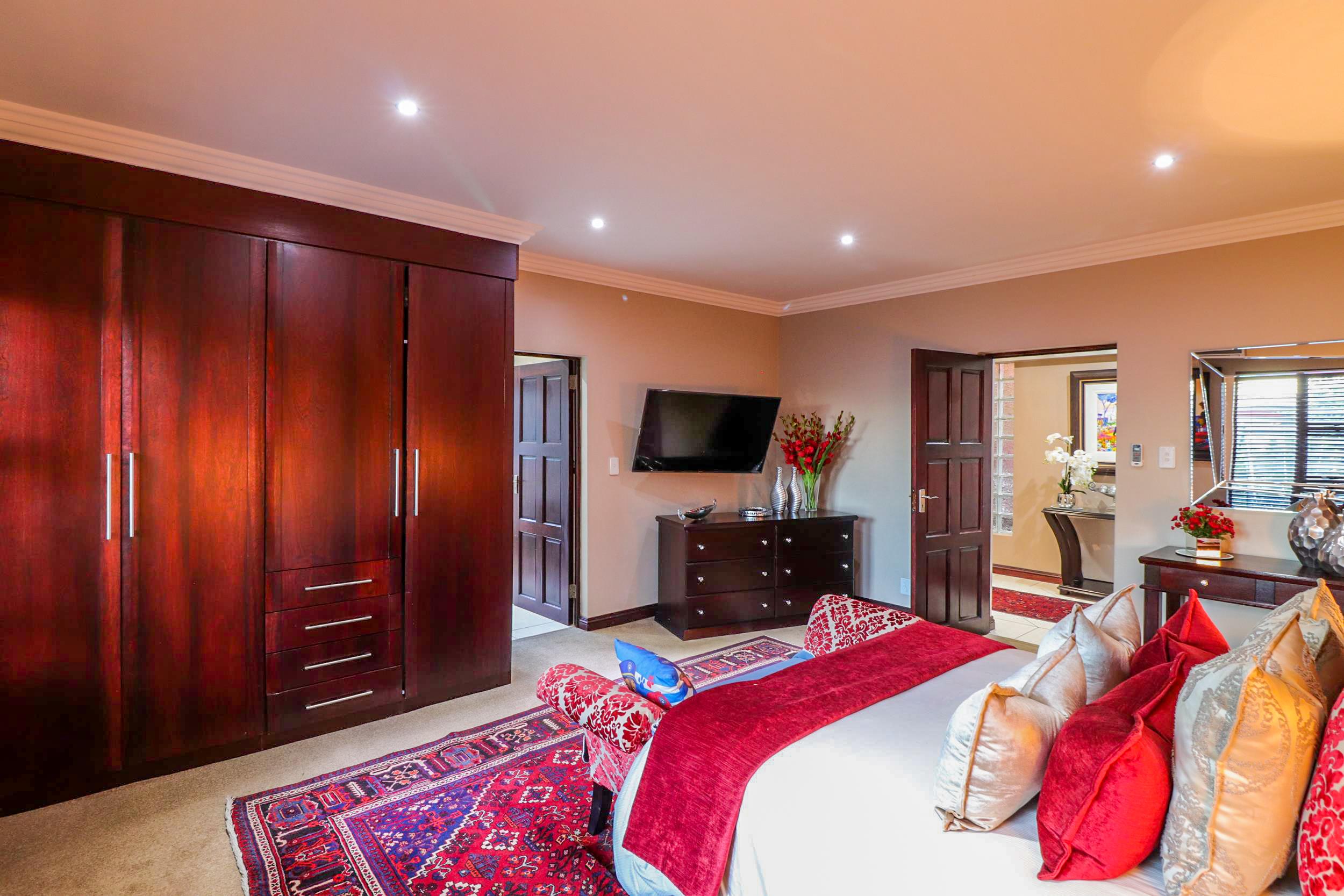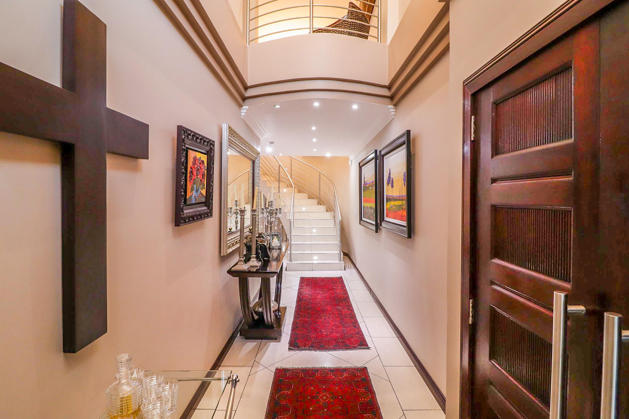 This luxurious home was master built and designed to exacting standards of perfection with attention to detail and faultless workmanship. The inviting entrance sets the tone for the home that offers simplicity and pleasure of luxury combined with comfort. The double front door opens to high volumes. A curved staircase with large windows overlooking the pool and entertainment area. Formal lounge with large cascading windows overlooking the pool area. A 14 seater luxury dining room, the well designed kitchen has granite surfaces, a central island a prep bowl, double ovens, separate scullery and outside laundry. Family lounge offers fitted TV wall unit, gas fireplace, stack doors to the entrainment area, guest bathroom, entertainment room with built in wooden bar built-in braai, guest toilet, snooker room with stack doors to the outside entertainment area. PJ lounge with fitted kitchenette, study, 6 glamorous bedrooms, 6 luxury bathrooms.