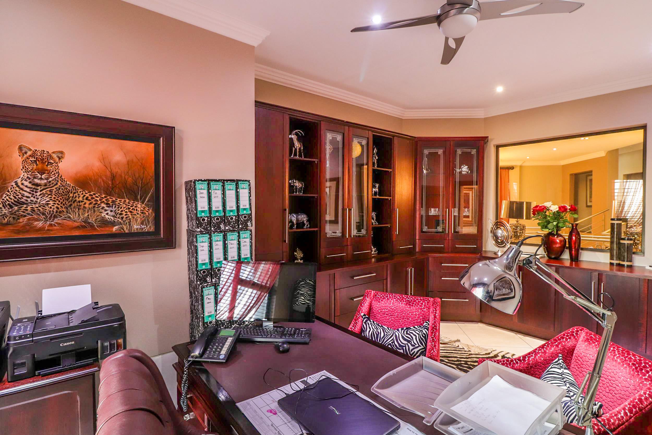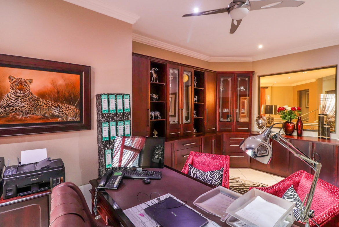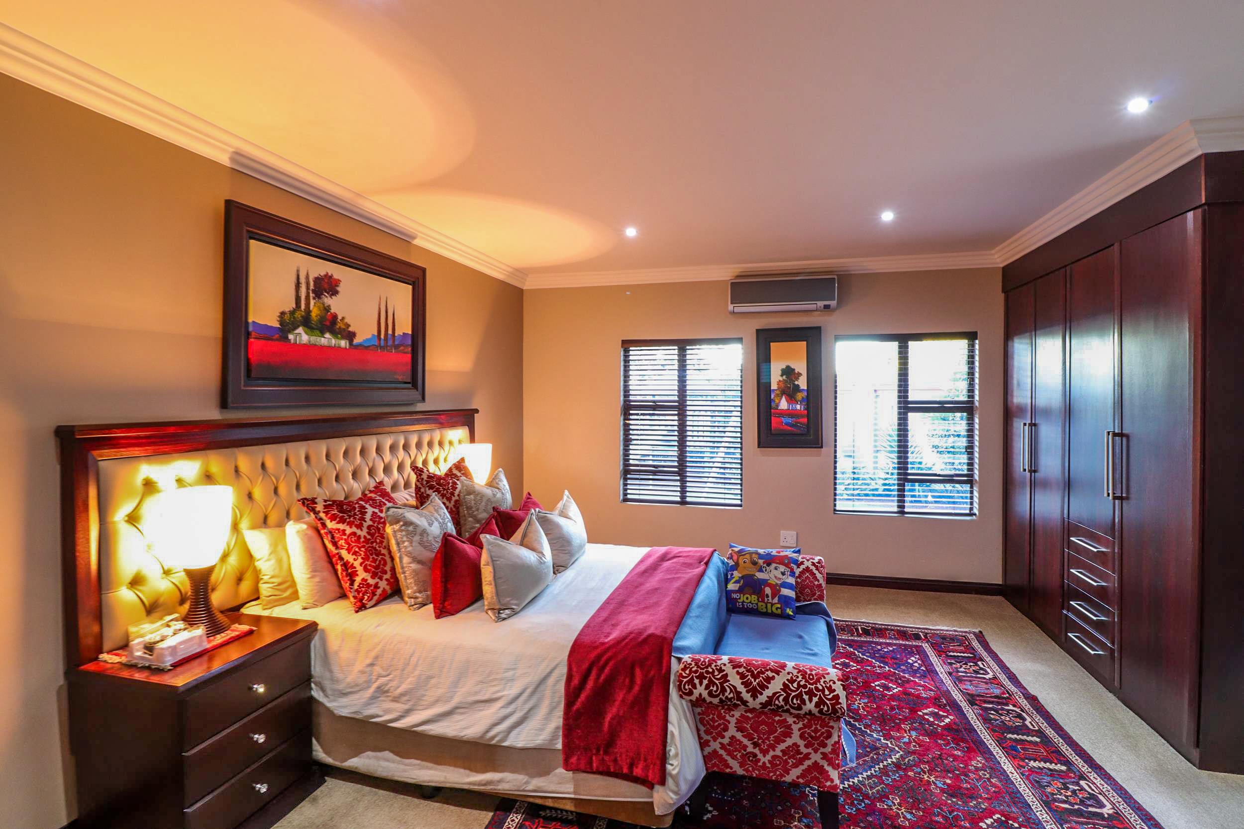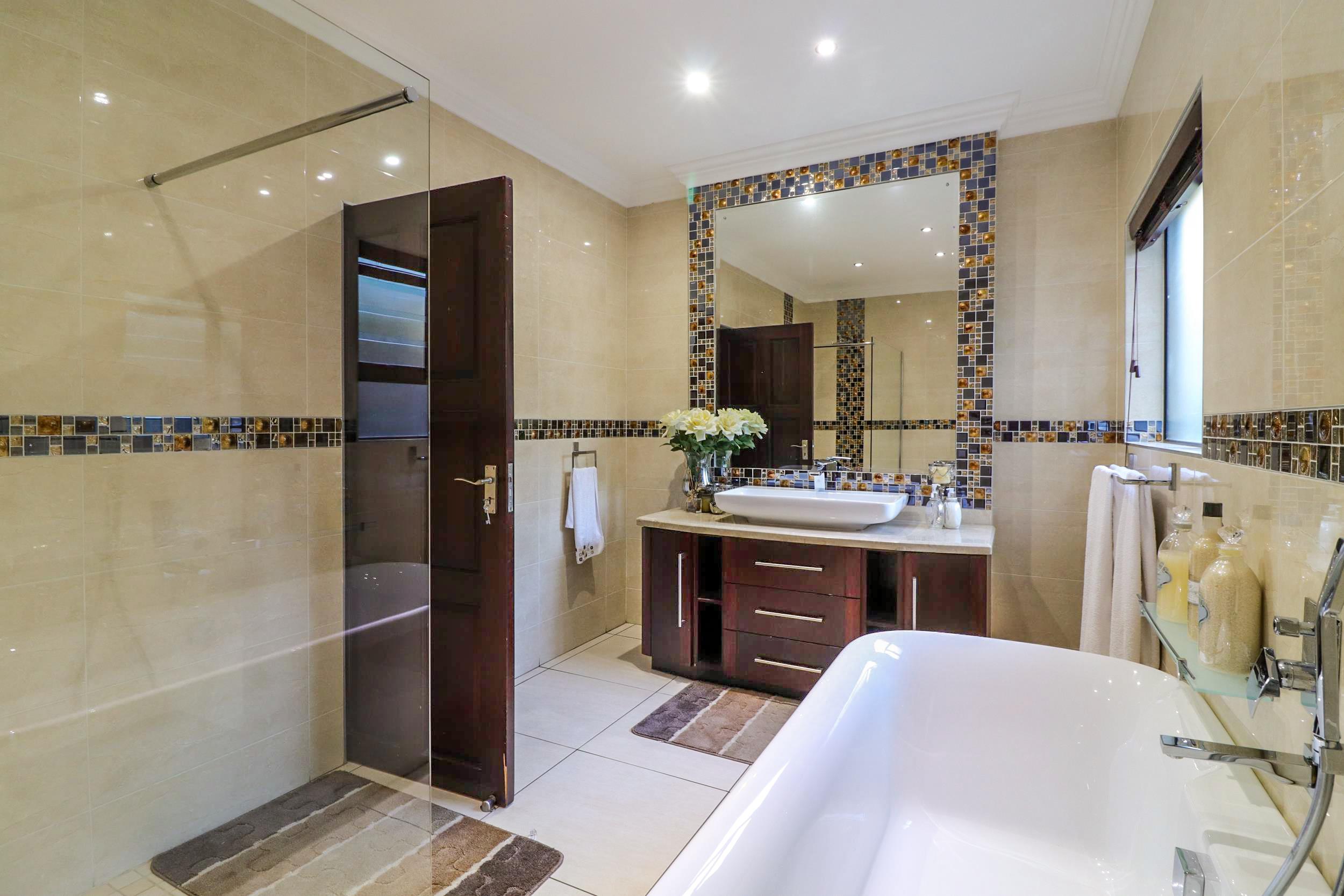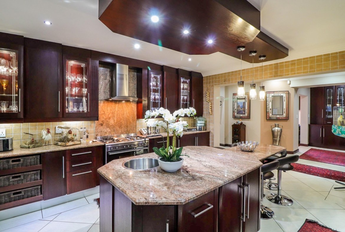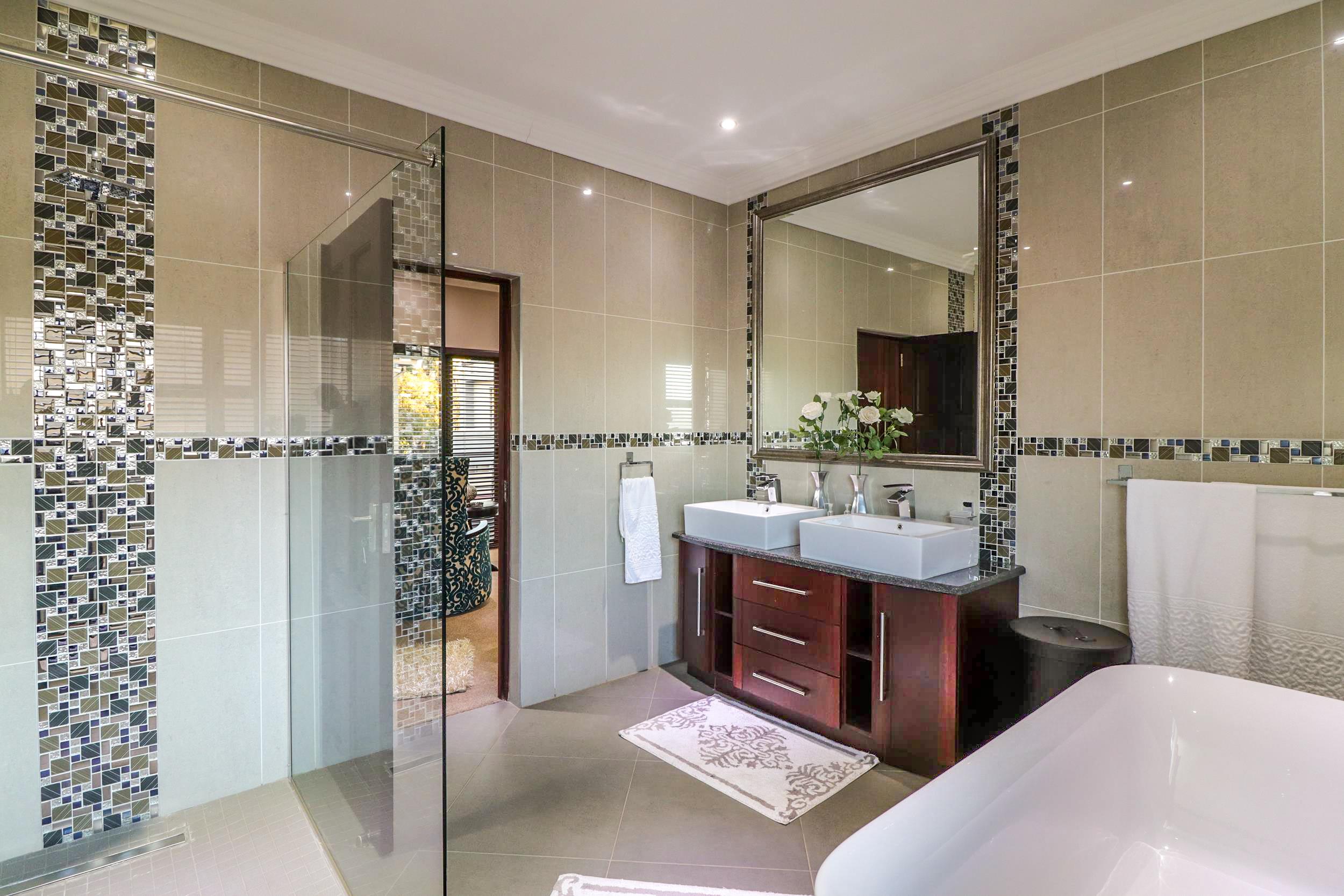 This luxurious home was master built and designed to exacting standards of perfection with attention to detail and faultless workmanship. The inviting entrance sets the tone for the home that offers simplicity and pleasure of luxury combined with comfort. The double front door opens to high volumes. A curved staircase with large windows overlooking the pool and entertainment area. Formal lounge with large cascading windows overlooking the pool area. A 14 seater luxury dining room, the well designed kitchen has granite surfaces, a central island a prep bowl, double ovens, separate scullery and outside laundry. Family lounge offers fitted TV wall unit, gas fireplace, stack doors to the entrainment area, guest bathroom, entertainment room with built in wooden bar built-in braai, guest toilet, snooker room with stack doors to the outside entertainment area. PJ lounge with fitted kitchenette, study, 6 glamorous bedrooms, 6 luxury bathrooms.